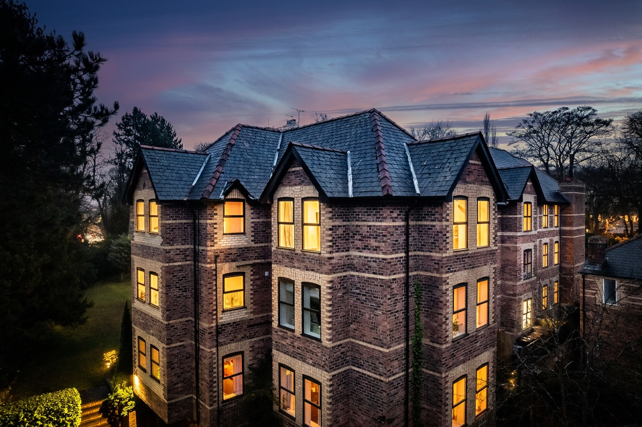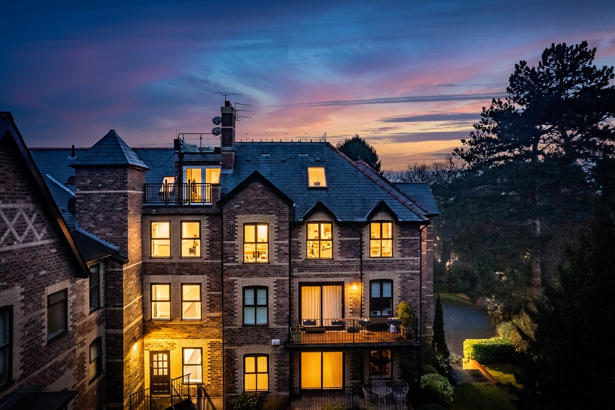 A truly exceptional duplex penthouse apartment occupying one of the highest point in Altrincham with breath-taking views, private outdoor space and a rare sense of exclusivity. Situated within an intimate development of just nine apartments off Booth Road, this remarkable home has been owned by the same family since it was purchased new in 1985 and benefits from a strong community feel with predominantly long-standing residents. The building is professionally managed by a small management company and the communal areas are in the process of being modernised with new flooring and freshly decorated, reflecting the care and pride taken in the development. The service charge is approximately £375 per month and includes cleaning, rubbish collection, window cleaning and garden maintenance, ensuring effortless living. The property also benefits from two parking spaces, one secure underground space with an electric up and over garage door operated by fob plus an additional above-ground space with further storage.