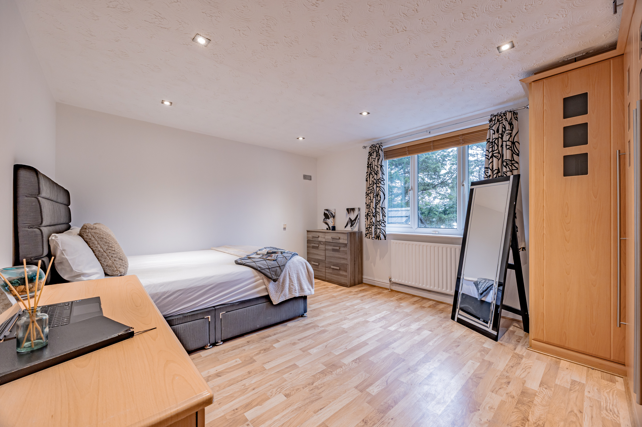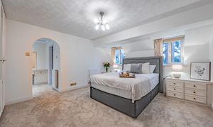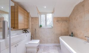 Upstairs, the galleried landing enjoys a bright and spacious feel thanks to its high ceiling, chandelier-style light fitting, feature window to the front, and a small balcony area. To the left, a short door leads into useful eaves storage. The main bedroom benefits from two windows overlooking the garden and opens through an archway into a generous dressing room with a large front-facing window. An ensuite completes this lovely suite, and an airing cupboard housing the water tank sits nearby. Another bedroom with wooden laminate flooring overlooks the rear garden and currently holds a single bed, though it would comfortably take a double. A further double bedroom features fitted wardrobes and a built-in desk, while the family bathroom serves these rooms equipped with a bath. A final spacious double to the front also enjoys fitted wardrobes and a fitted desk.