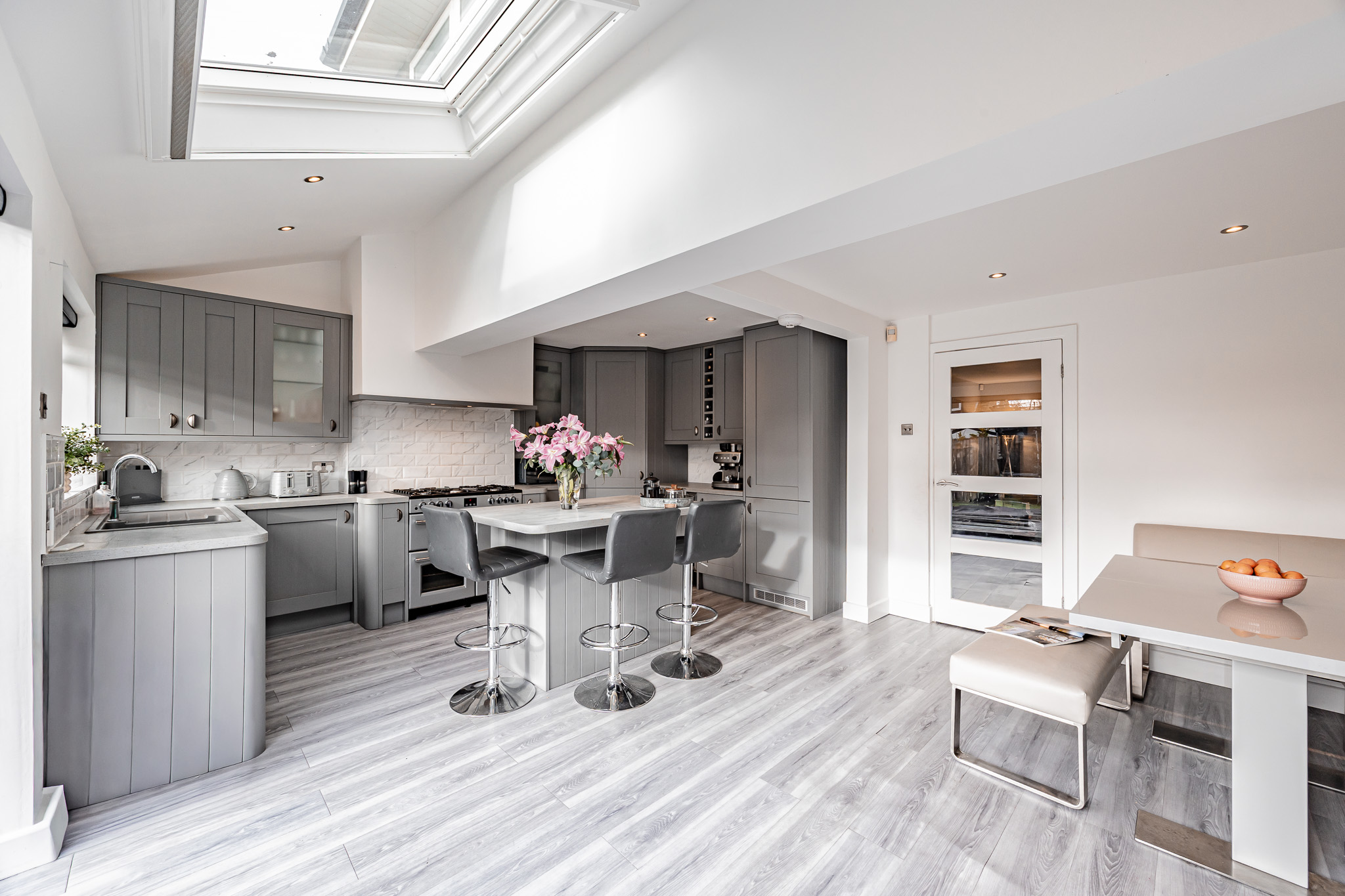To the rear is a stunning open-plan dining kitchen, finished with wood-effect LVT flooring and designed for modern family living. The kitchen includes a central island with seating and storage, a Belling range cooker with gas hob, electric and gas ovens, integrated fridge freezer, half-size dishwasher, slimline wine fridge, and integrated washing machine. A large skylight with electric blind fills the space with natural light, while electric blinds are fitted to all rear-facing windows and doors. Bi-fold doors open onto the decked seating area, creating a seamless indoor-outdoor feel.
