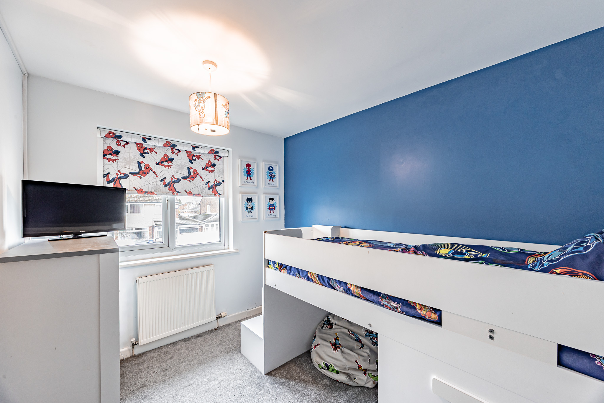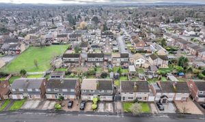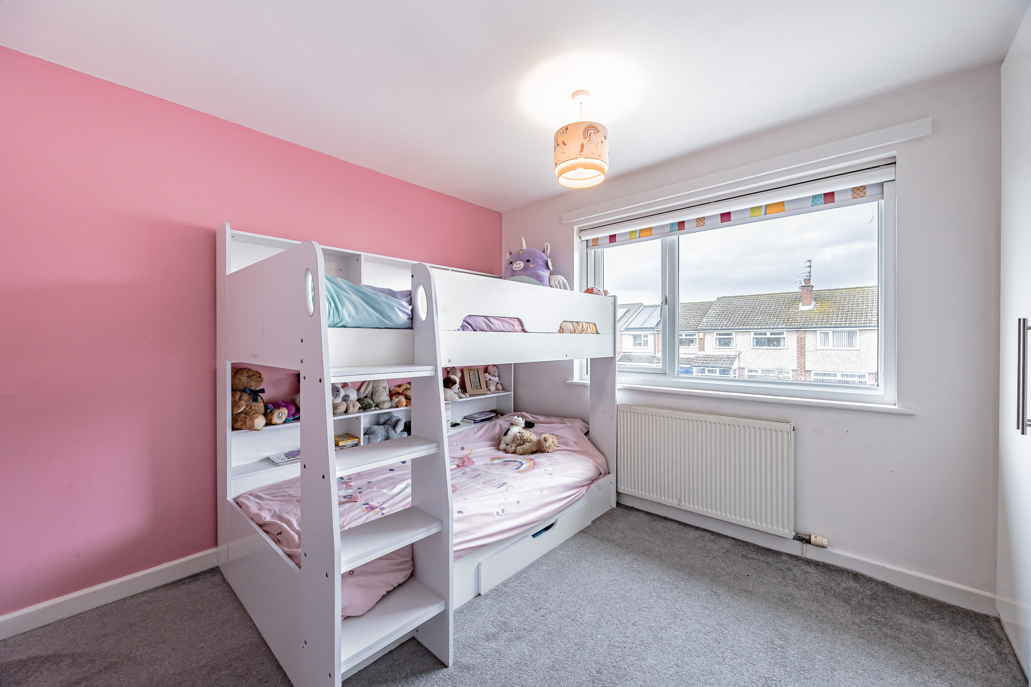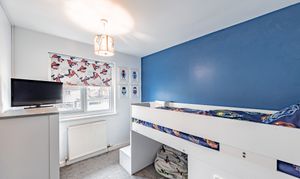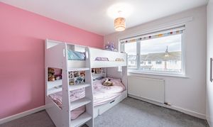 Upstairs, a bright landing with a side window provides access to three well-proportioned bedrooms and a contemporary family bathroom. The principal bedroom enjoys a pleasant outlook over the rear garden and features built-in wardrobes, over-bed storage, a vanity unit and electric blinds. Bedroom two is a comfortable double with fitted wardrobes, while bedroom three is front-facing and would suit a child’s bedroom, nursery or home office.