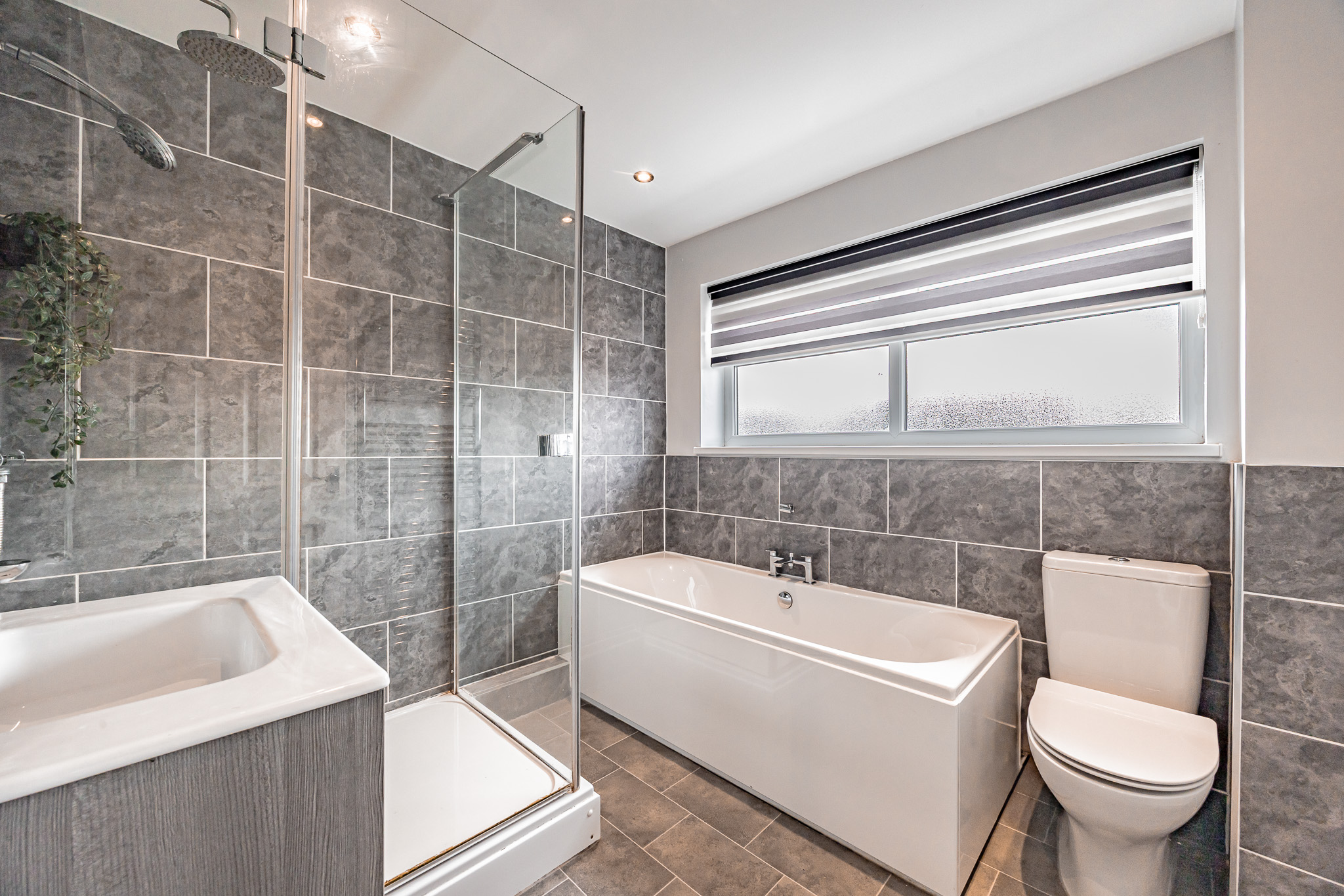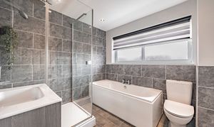 The family bathroom is thoughtfully arranged, featuring a separate bath positioned beneath a large window, a walk-in shower with both rain head and handheld attachment, vanity storage and attractive, modern tiling.