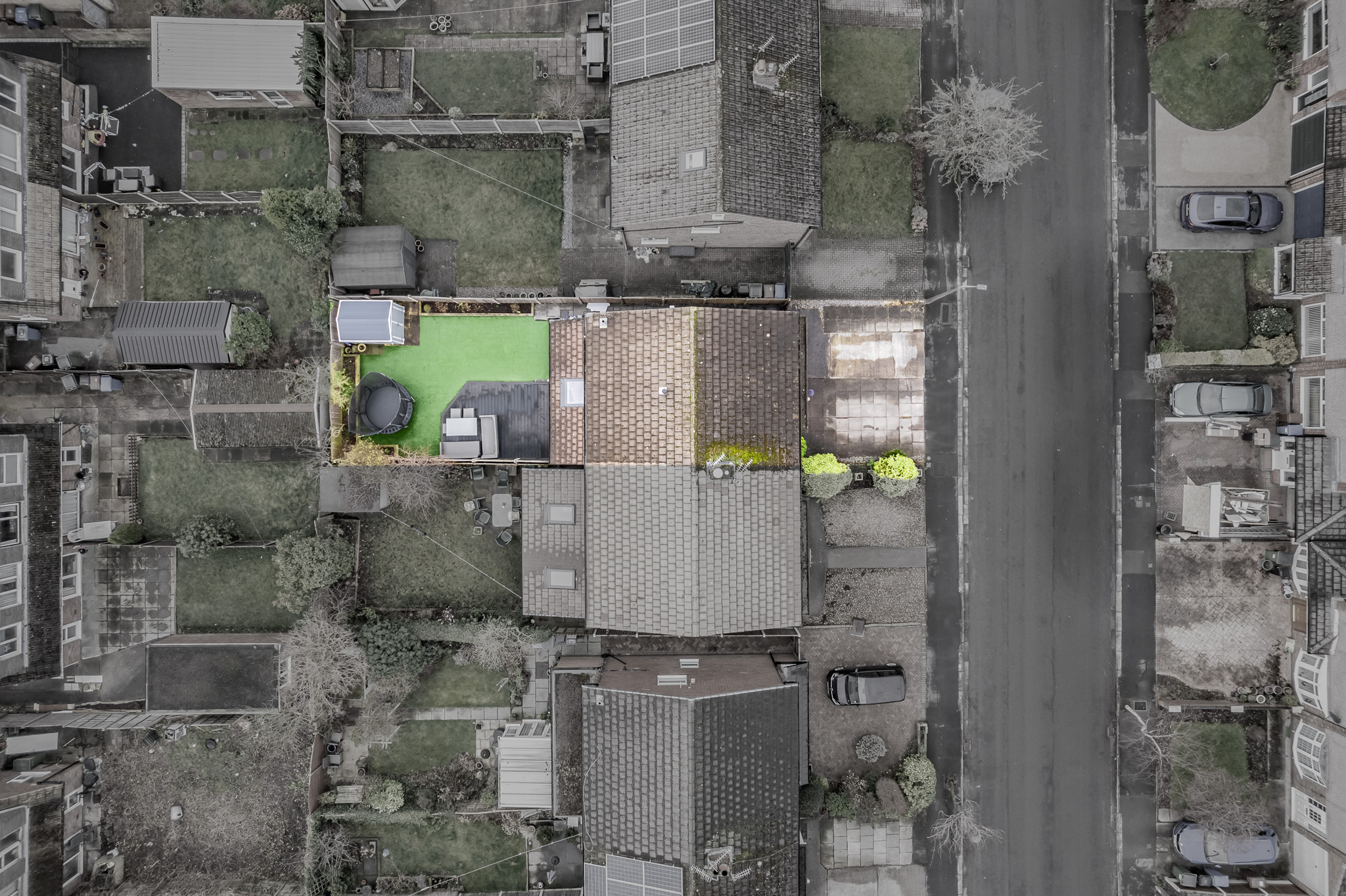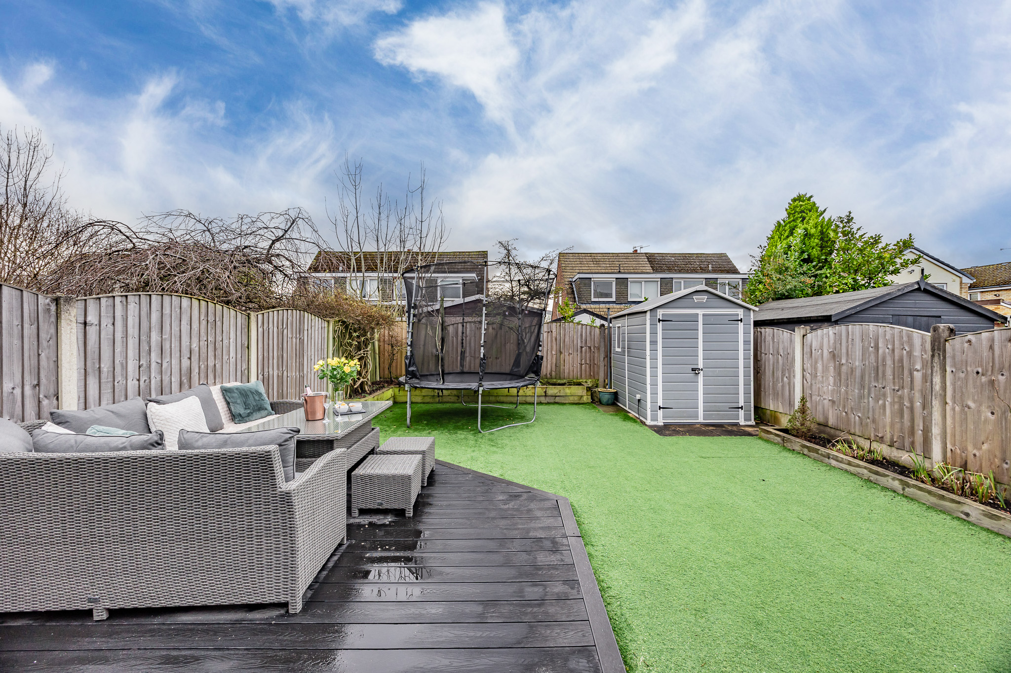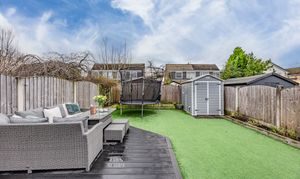 The low-maintenance rear garden is perfect for families, featuring artificial grass, raised planters, a decked entertaining area with a handy shed.