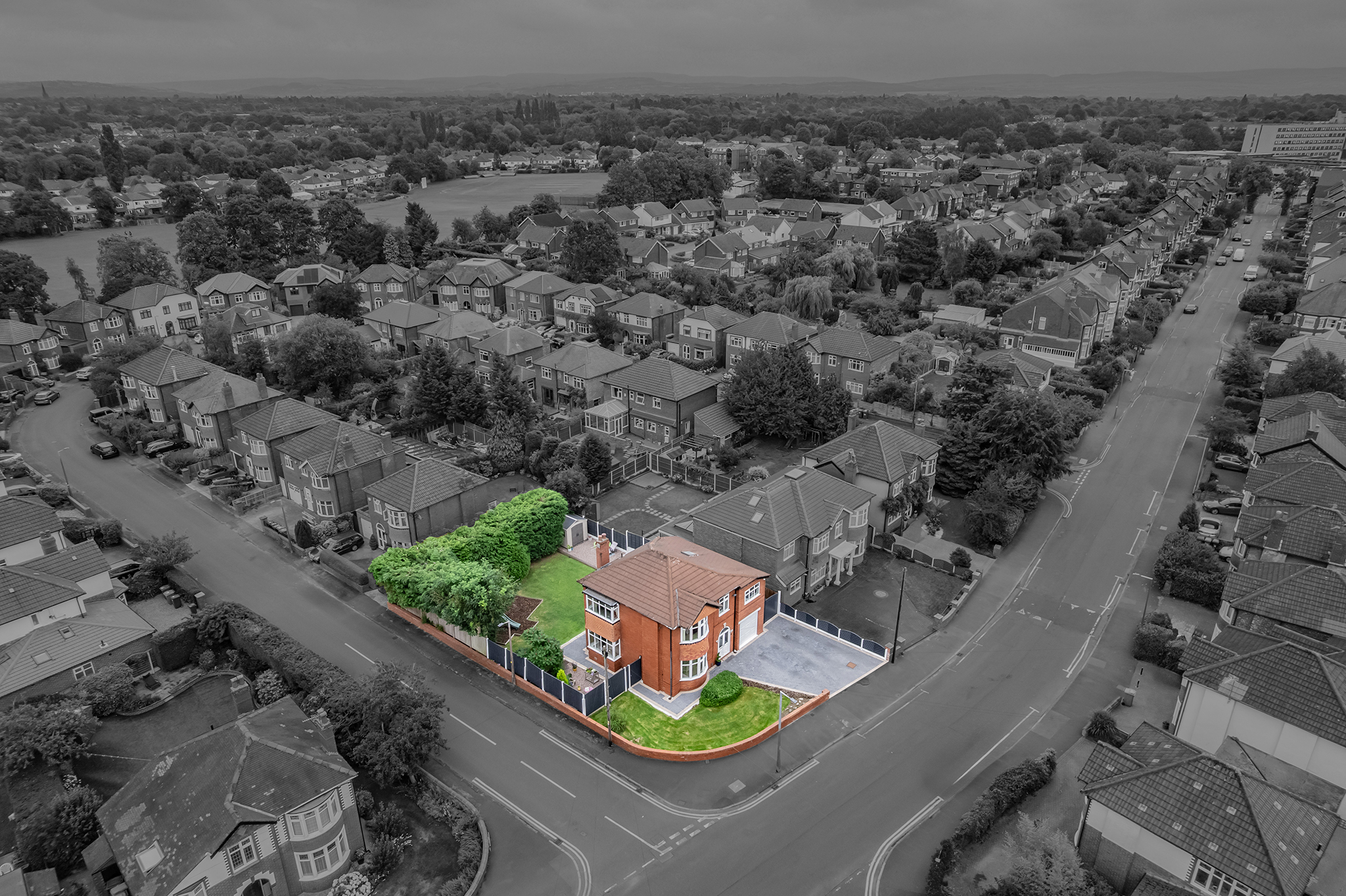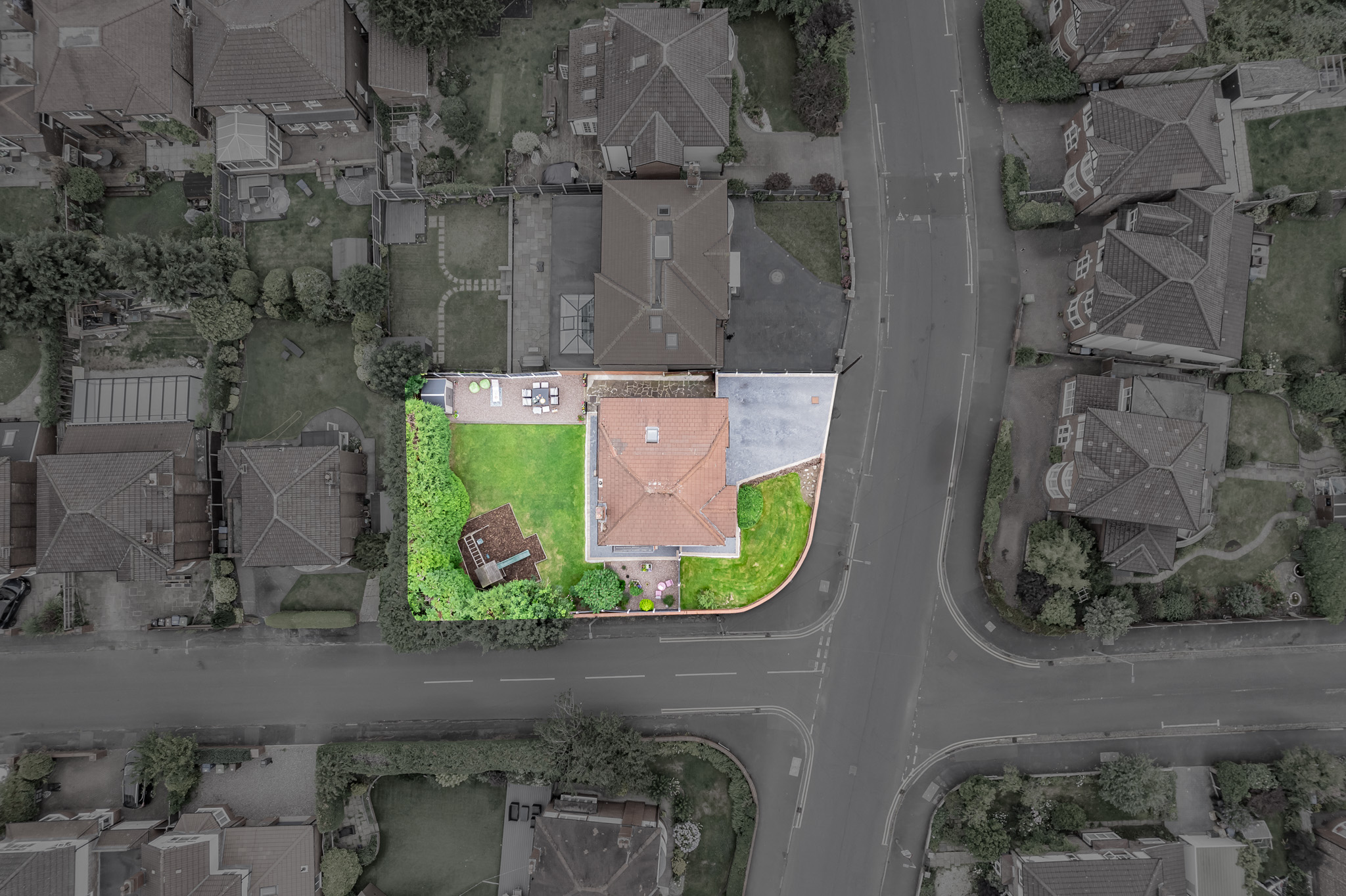 - Set on an impressive corner plot with a private wrap-around garden, thoughtfully landscaped with seating areas, lawn and a dedicated children’s play space.
