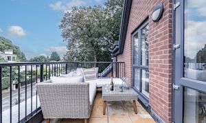For added convenience, a separate utility cupboard houses a washer-dryer, making laundry tasks easy and discreet. The apartment features a private, expansive balcony off the living room, which is ideal for alfresco dining or quiet moments of relaxation, offering tranquil views over Lancaster Road.