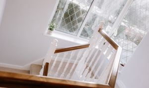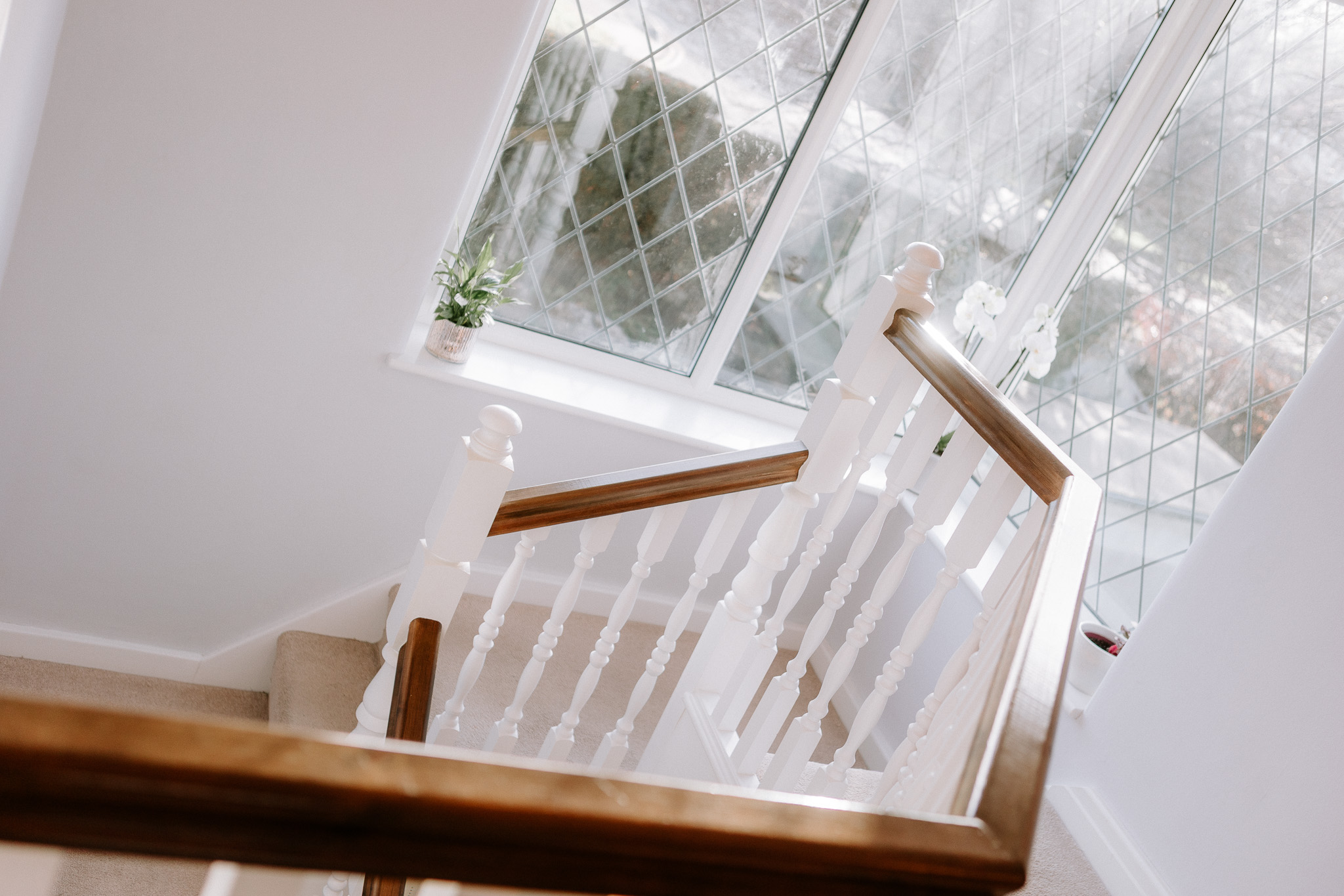As you arrive, the home’s newly rendered façade gives an immediate sense of freshness and care. A welcoming porch opens into a warm and inviting hallway, where wood-look flooring, understairs storage for coats and shoes, and elegant double doors hint at the space and style to come. Natural light streams down the turning staircase from a striking corner window, illuminating the landing above.