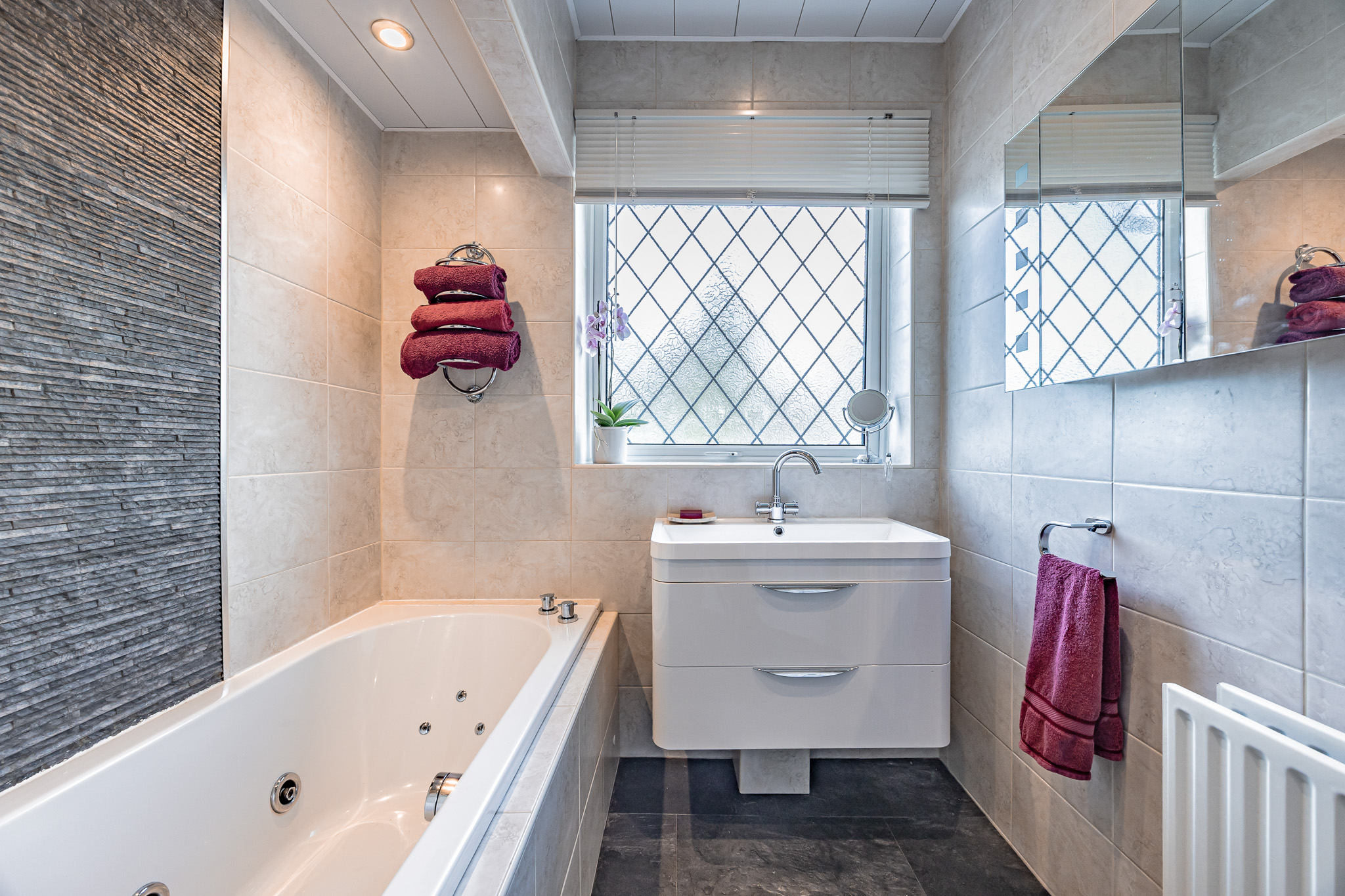 Upstairs, the landing is bathed in natural light from the beautiful corner window. The principal bedroom sits to the left and enjoys fitted wardrobes with drawers, a front-facing aspect, and an elegant en-suite. The en-suite features a steamer shower, under-sink storage and a large corner cupboard for additional practicality, as well as a window overlooking the garden. To the right is a bright double bedroom with integrated shelving, space for freestanding wardrobes and a ceiling fan with lighting. The family bathroom features a whirlpool bath, under-sink storage with mirrored cabinet above and a rear window, while the separate WC sits adjacent for added convenience. The smallest bedroom, currently used as an office, would make an ideal nursery or child’s bedroom with an alcove space for storage. The fourth bedroom is a generous dual-aspect room with both side and front views, room for a sofa and built-in storage, a peaceful, south-east-facing space filled with morning light.
