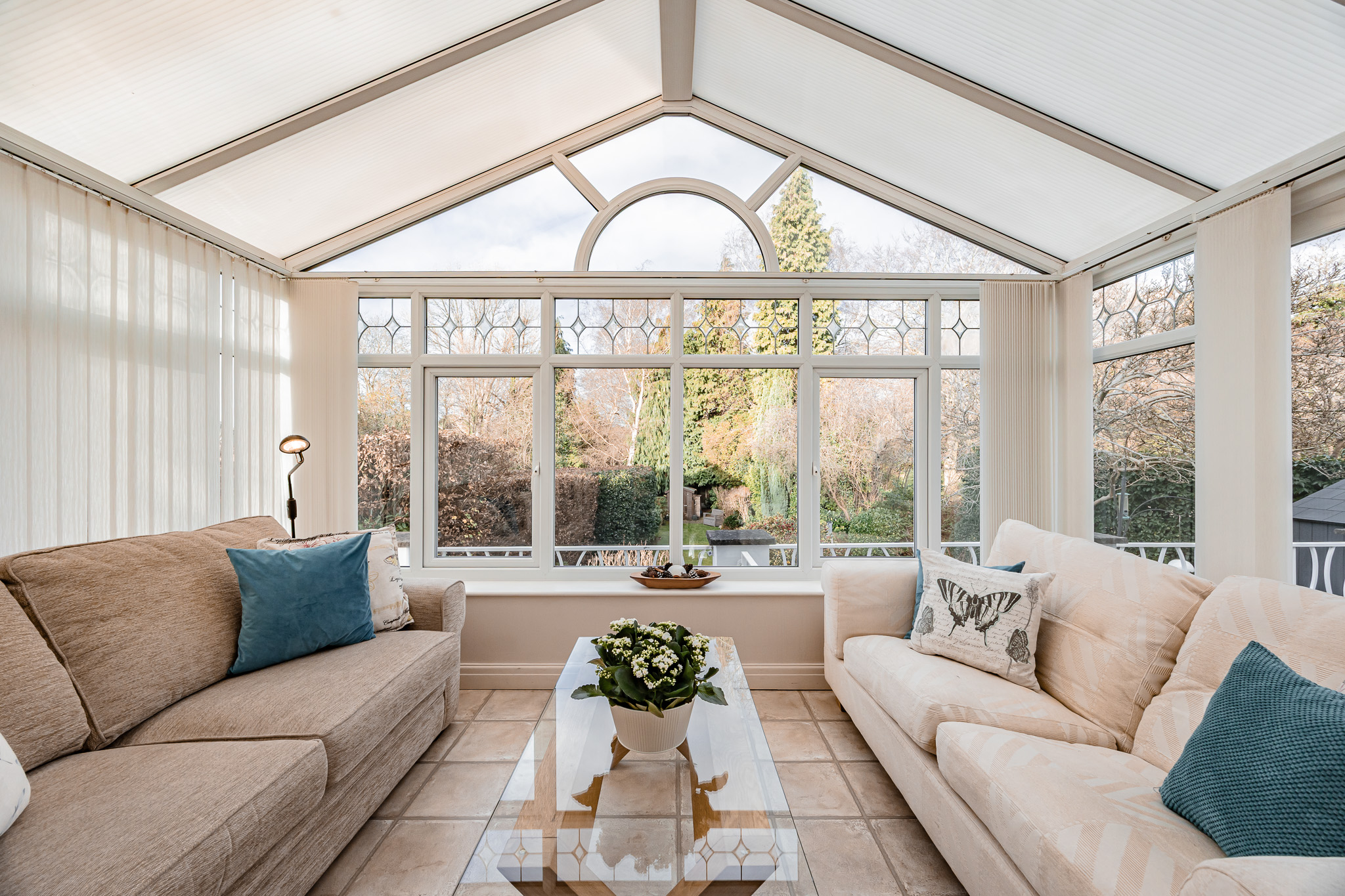 To the left, the dual-aspect living room is an exceptionally spacious and atmospheric retreat. A beautiful marble-surround gas fireplace sits centre stage, framed by windows on both sides and providing a cosy focal point on cooler evenings. The room is generous enough to house a piano without compromising space. Tilt-and-slide patio doors open onto the conservatory, creating a seamless indoor–outdoor flow. This light-drenched conservatory, with its vaulted ceiling and wraparound windows, offers uninterrupted views across the garden, an ever-changing canvas of colour and light throughout the year. French doors open out to the patio, where you can watch the sun set behind the fir trees.