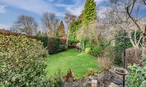 Externally, the rear garden is a truly magical haven. Immediately outside the conservatory and kitchen is a wide, elevated terrace laid with concrete stone-effect slabs, perfect for outdoor dining and relaxation. Steps on either side lead down to a beautiful lower patio area finished in York Stone, framed by raised planters on either side of the seating area, an ideal spot for summer gatherings. Beyond lies a generous lawn bordered by mature hedging, conifers, and a wonderful selection of planting including a magnolia tree, spruce evergreen and holly bush. A wooden shed sits at the bottom of the garden, while a side terrace provides access to a further storage shed. An iron gate on the kitchen door offers the perfect blend of security and airflow for families with young children or pets.