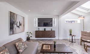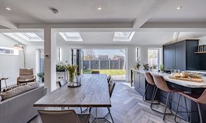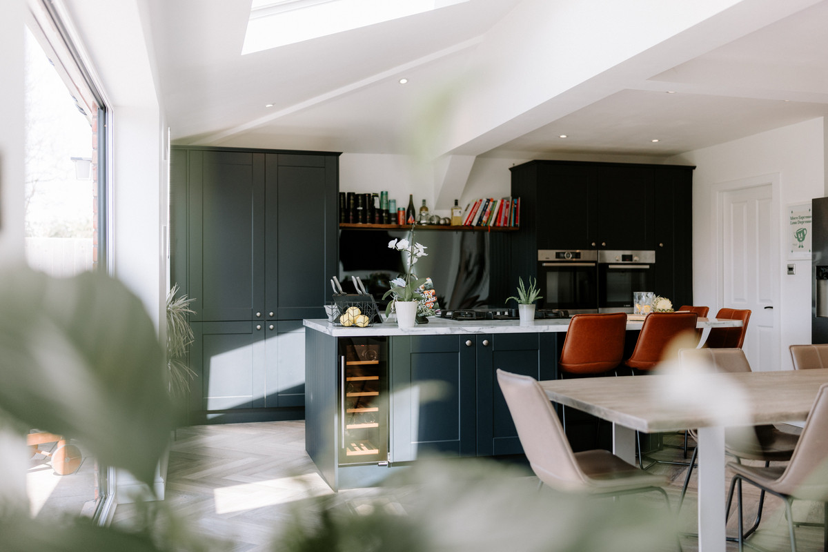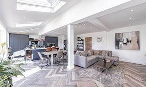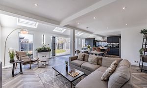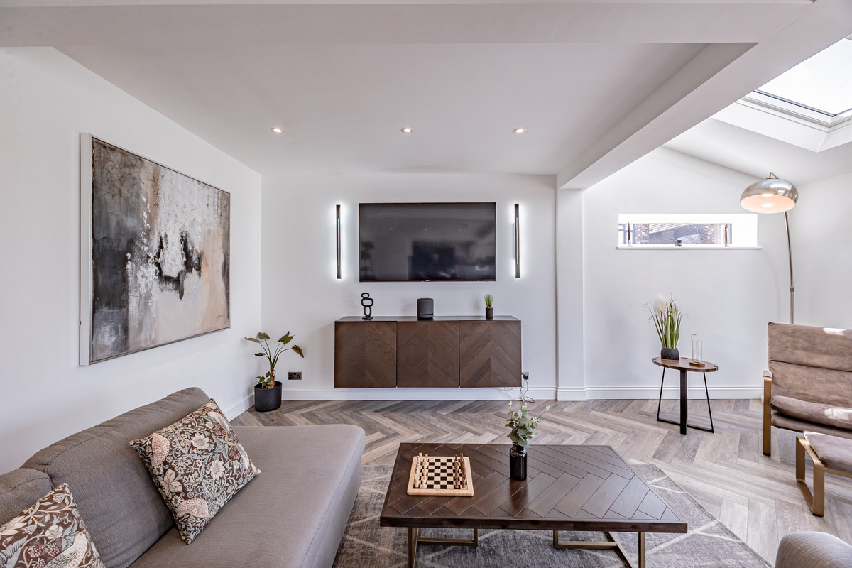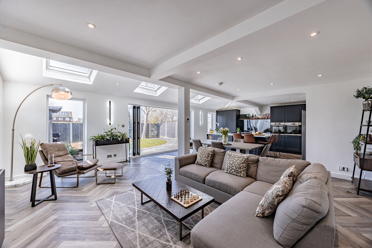 The showstopping heart of the home is the truly impeccable living kitchen – a breathtaking space that effortlessly combines style, quality, and functionality. At its centre sits a striking kitchen island, perfect for casual dining, entertaining, or simply gathering with family. This high-end, bespoke kitchen features sleek cabinetry and integrated, high-specification appliances, offering everything you could possibly wish for. Designed with both everyday living and entertaining in mind, the room comfortably accommodates both a dining and living area. Flooded with natural light from the expansive bifold doors and Velux windows, the space beautifully blurs the line between indoors and out in the warmer months. And when the weather turns, underfloor heating keeps the space warm and welcoming – a perfect retreat throughout the year.