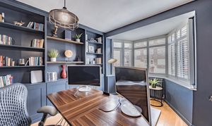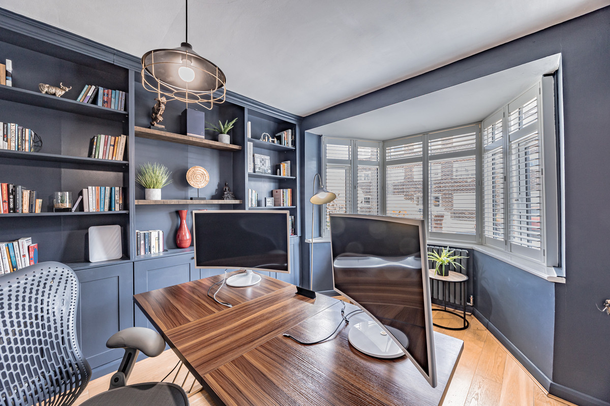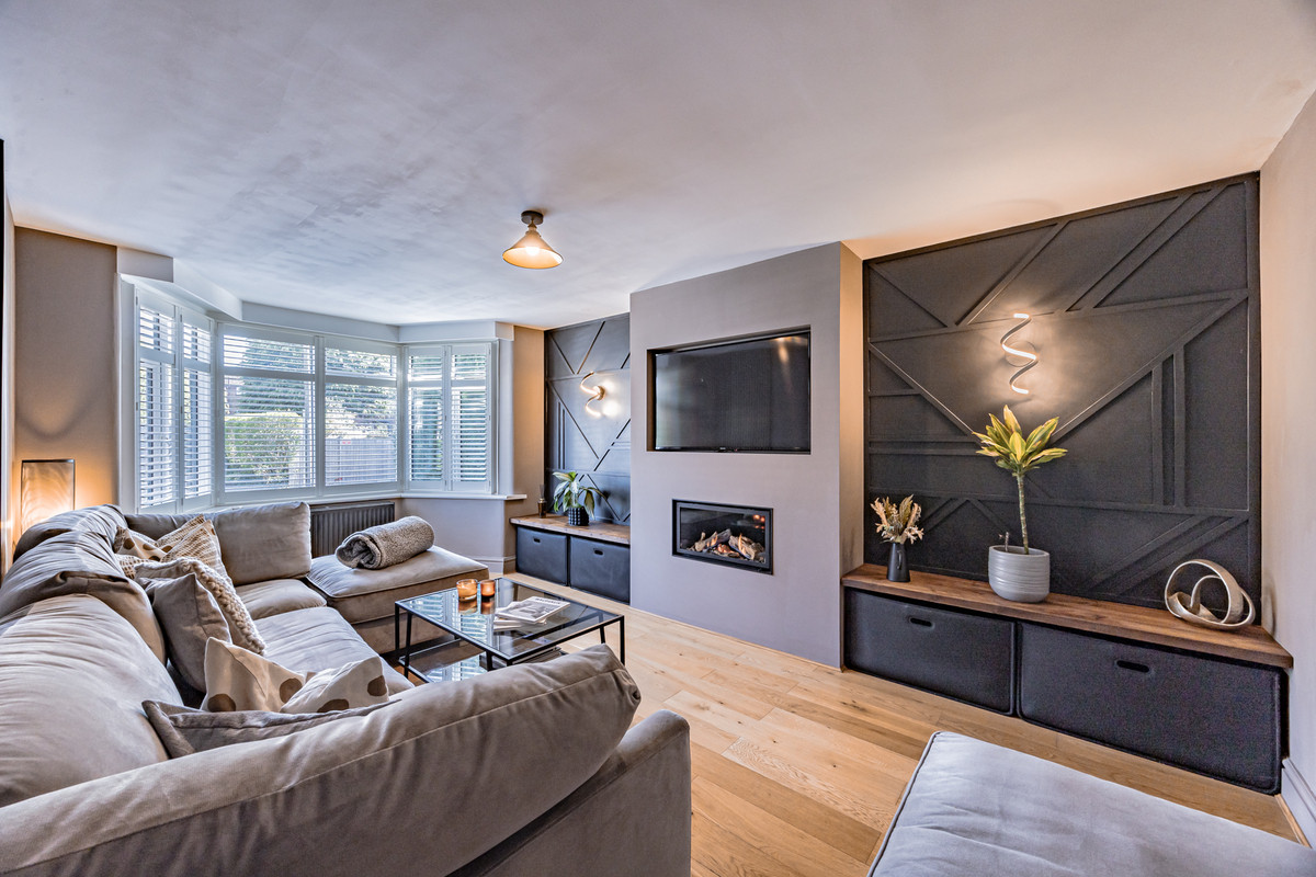 Now into the office, a beautifully appointed space featuring a stunning bay window that floods the room with natural light. With built-in storage and a finish of the highest standard, this room offers an ideal setting for a productive work-from-home environment. Now to the living room – an impressively sized and elegantly presented space, further enhanced by a charming bay window that adds both depth and natural light, creating a bright and airy atmosphere. A beautiful feature fireplace provides a warm focal point, while the solid oak flooring, which flows seamlessly from the hallway, adds a touch of timeless character and cohesion throughout.