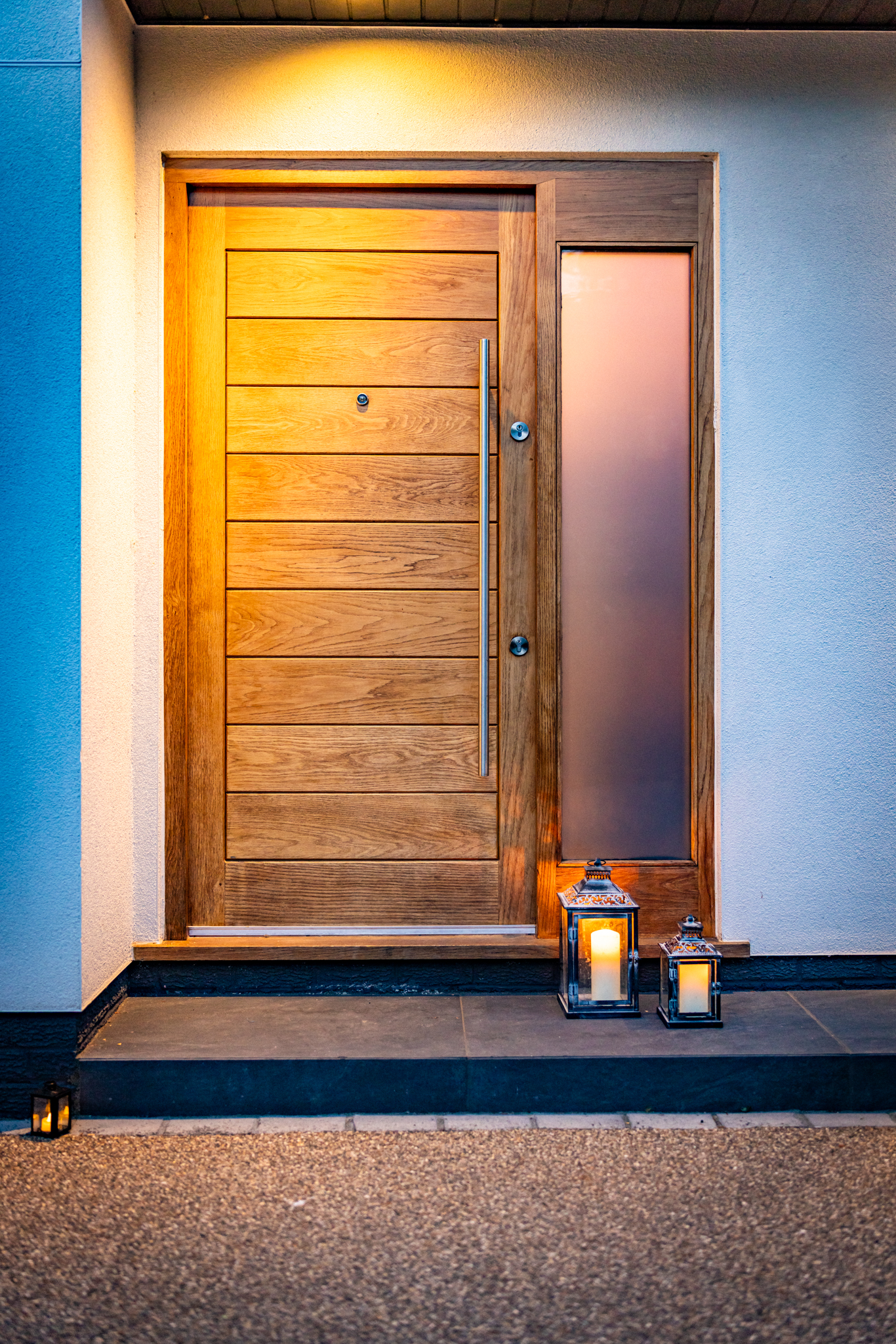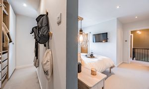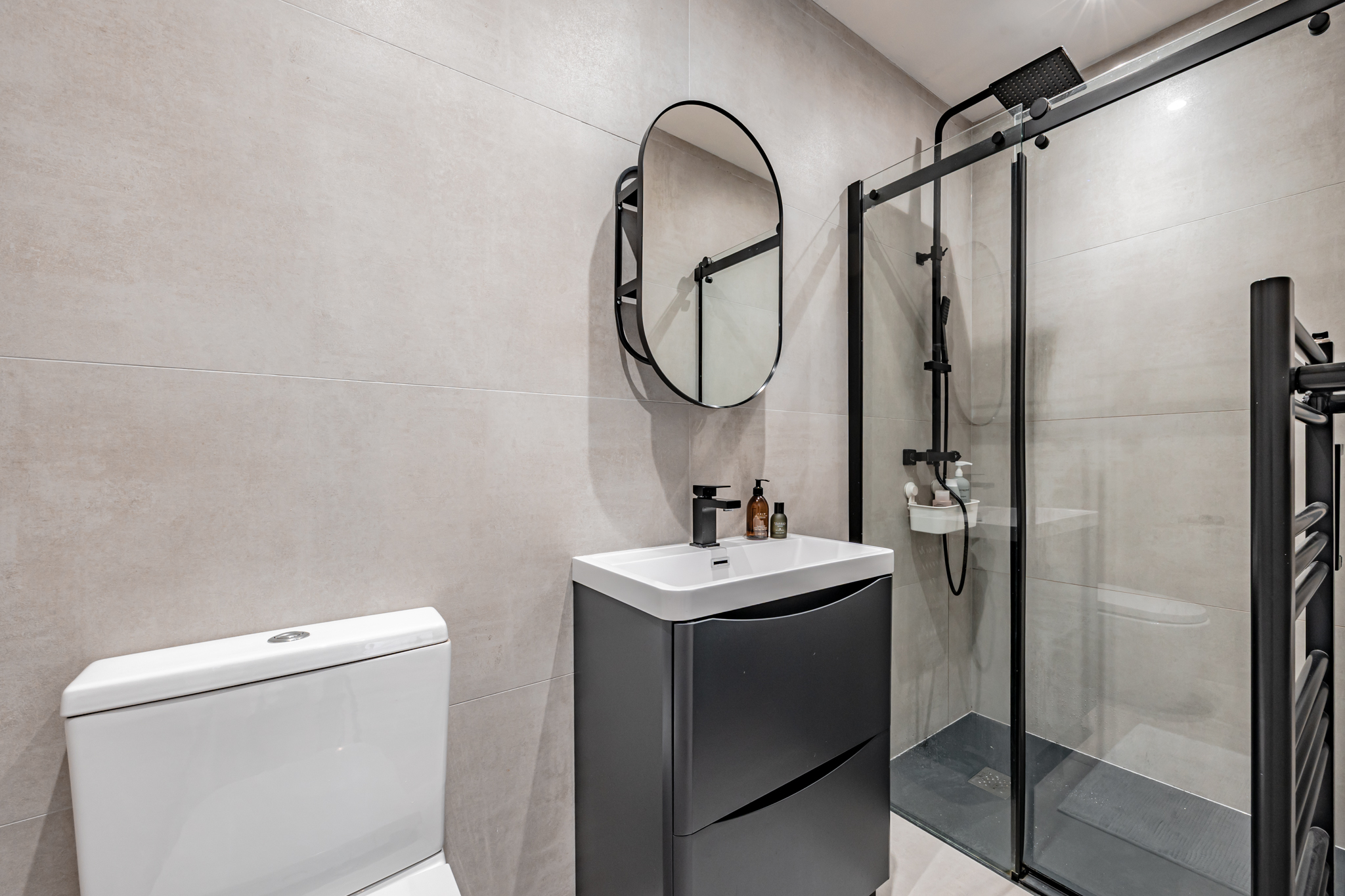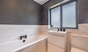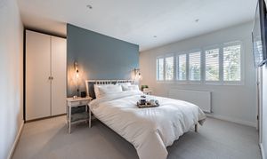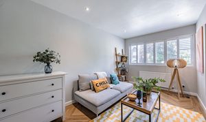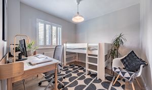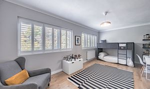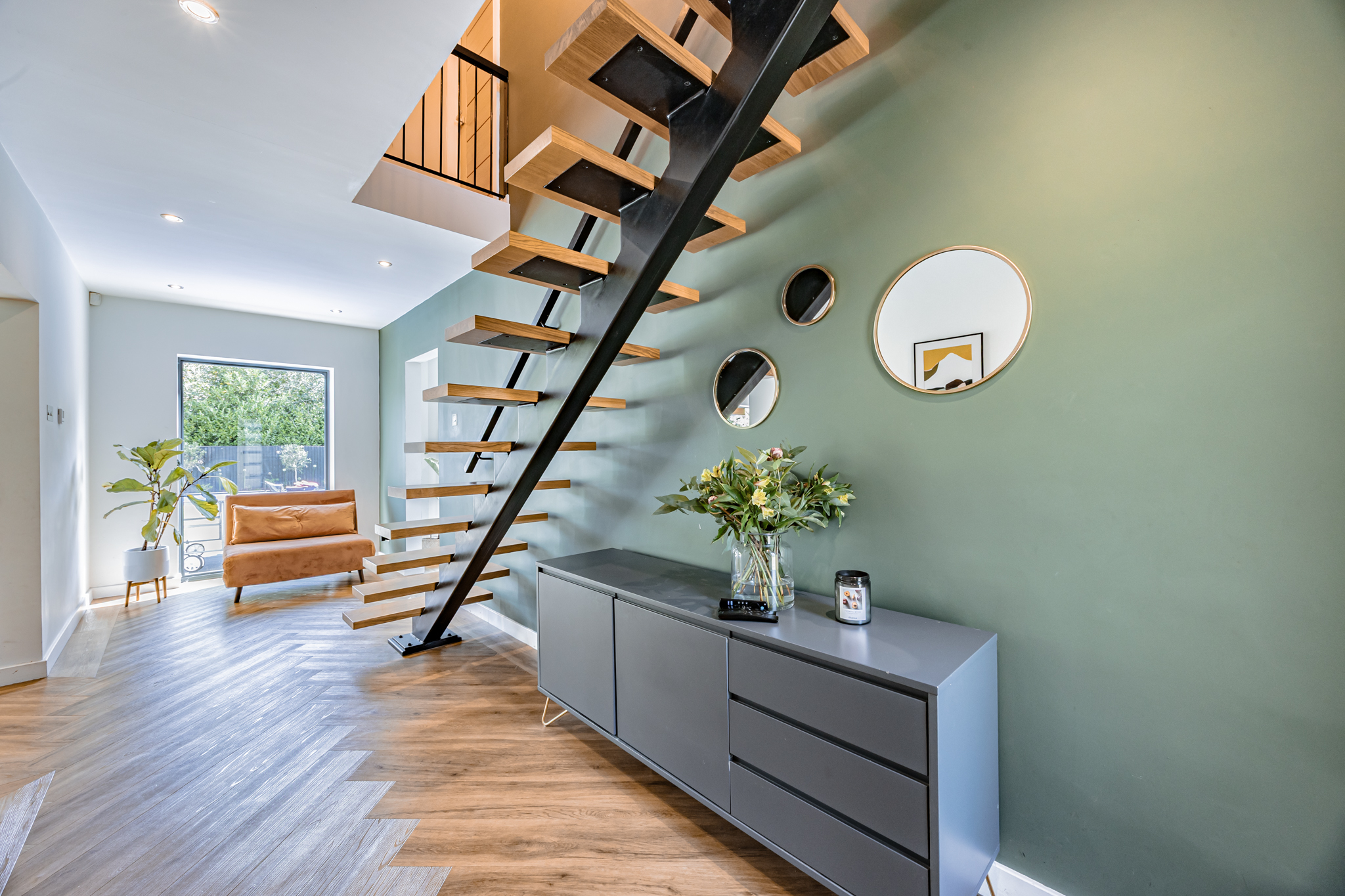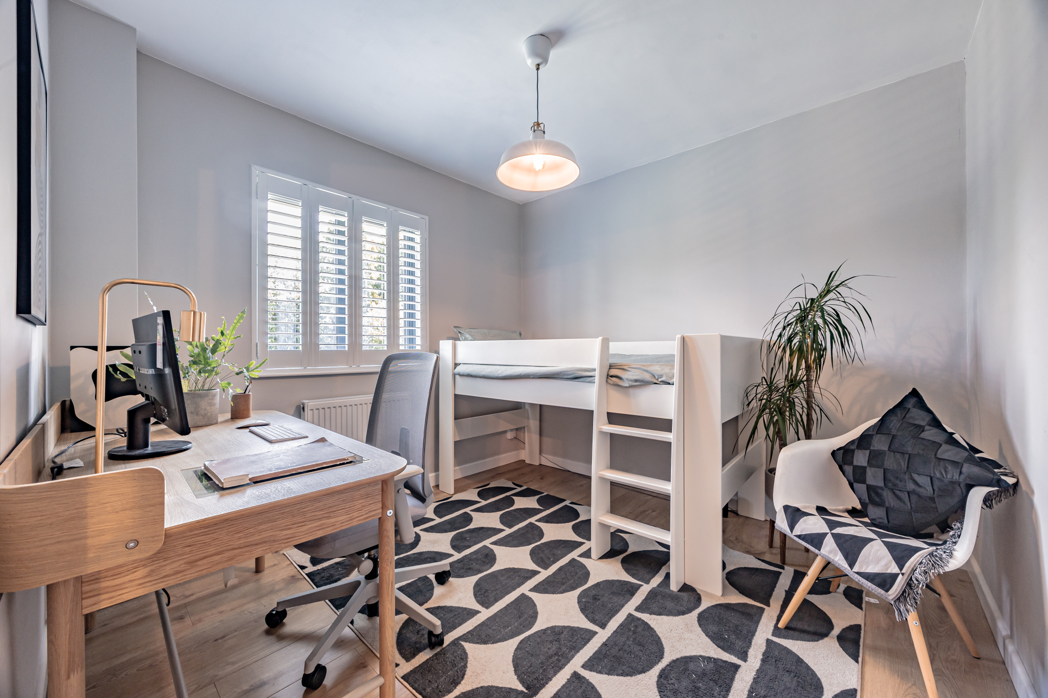 Upstairs, the home continues to impress. A statement wooden floating staircase leads to four generously sized double bedrooms, each finished with modern décor and plantation shutter blinds. The principal bedroom boasts a beautifully appointed en-suite and a bespoke dressing area, while a chic, three-piece family bathroom provides a serene space for relaxation. One of the rear bedrooms is currently arranged as a dual-purpose room, serving as both a bedroom and an office.