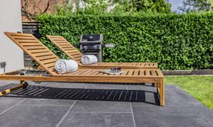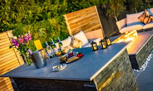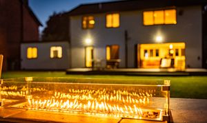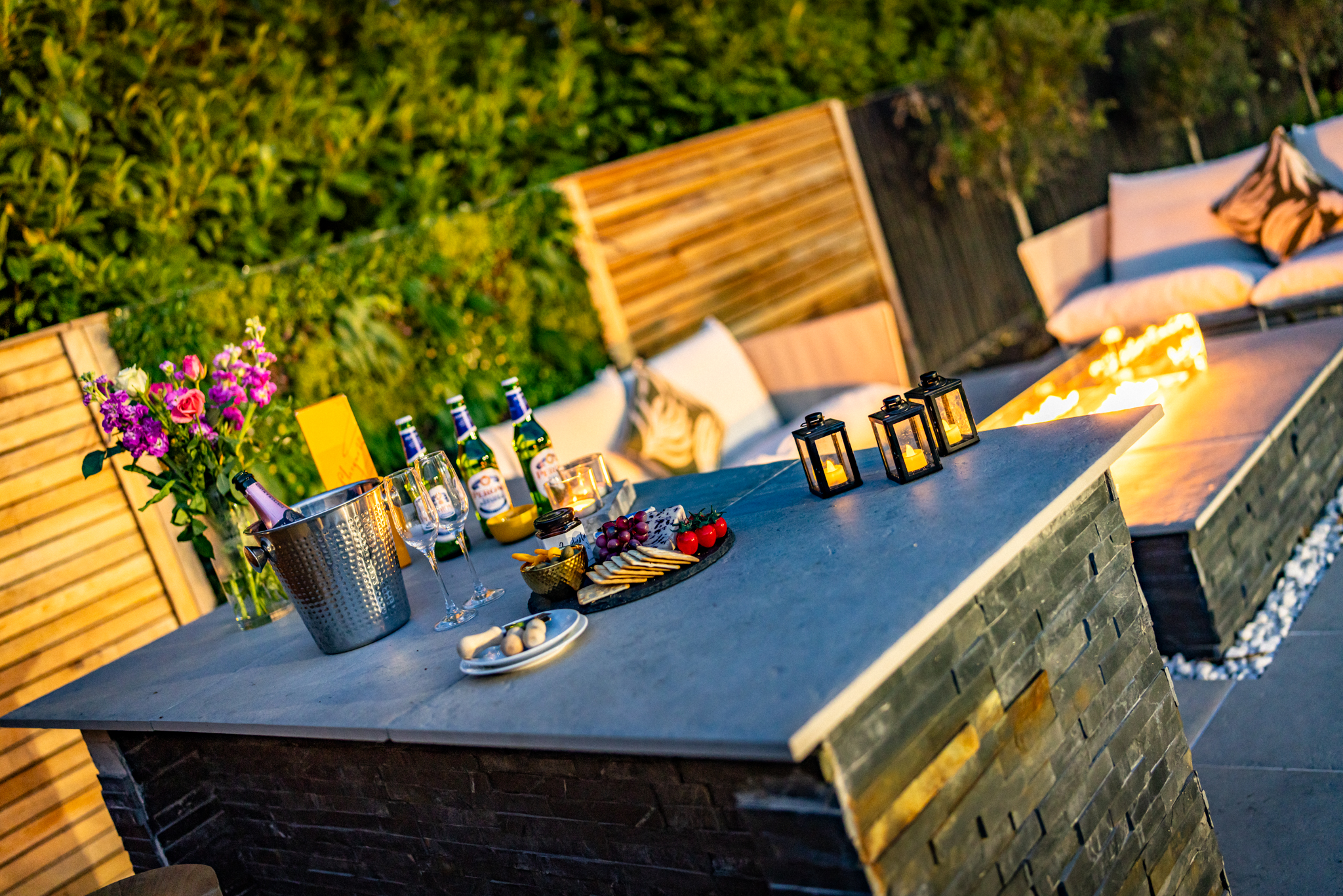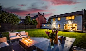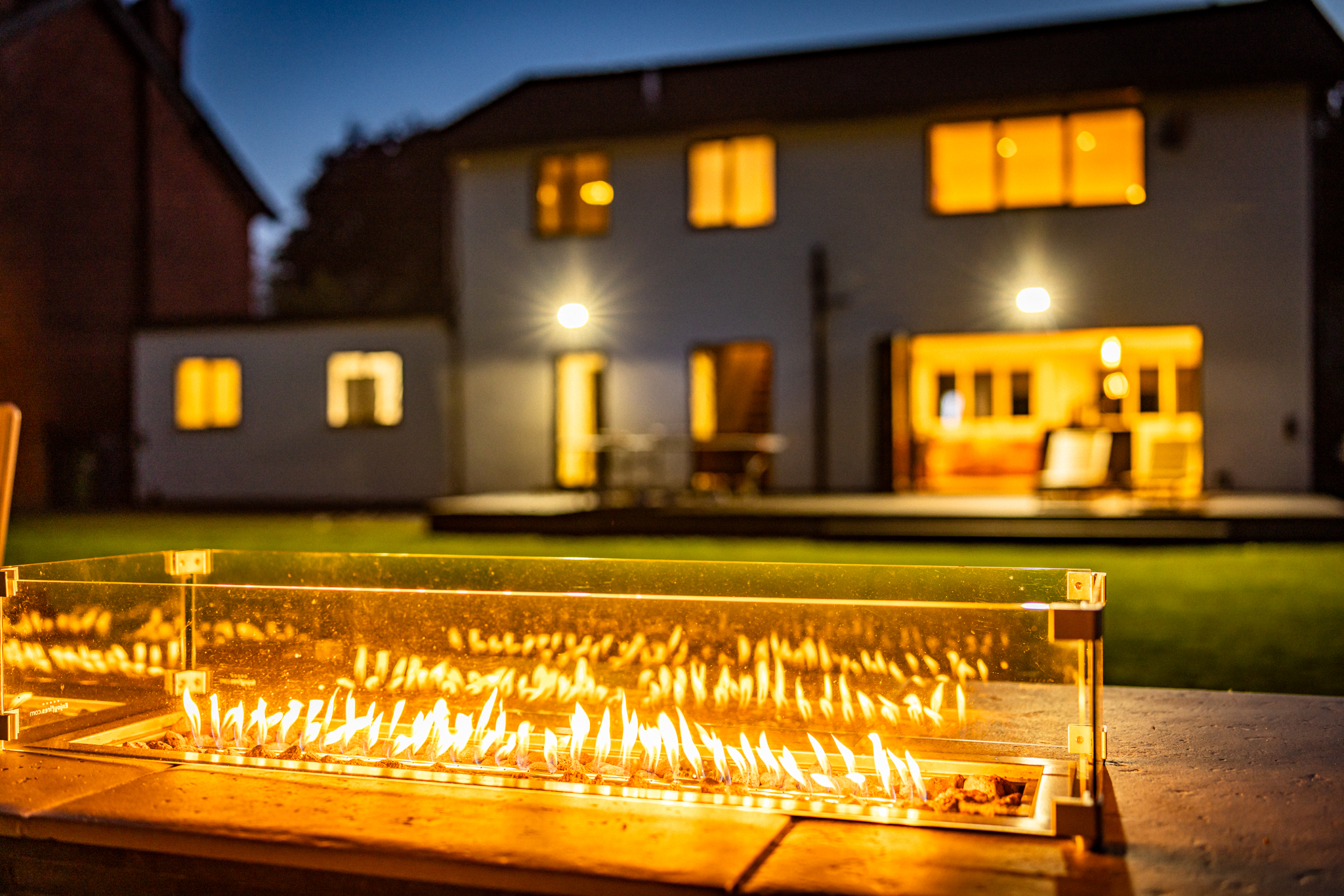 Sun trap at rear of the garden late spring evening with the fire pit on
