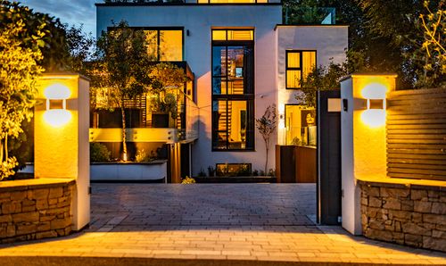 The garden itself is a true highlight—generous in size, private, and bathed in sunlight throughout the day. It features a non-slip porcelain tiled patio, ideal for alfresco dining, alongside a large, manicured lawn perfect for children's play. A raised entertaining terrace at the rear offers an additional space for summer gatherings, bordered by mature planting and atmospheric lighting. A powered shed adds practicality to this impressive outdoor retreat.