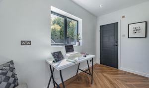 The ground floor also includes a separate snug lounge, providing a cosy space for relaxing or enjoying movie nights. Cleverly utilised corners of the home, such as a reading nook and a peaceful study with garden views, add to the versatility of the layout. A stylish, modern bathroom suite with walk-in shower and porcelain tiling is located near the large double electric garage, currently configured as a fully equipped gym.