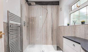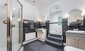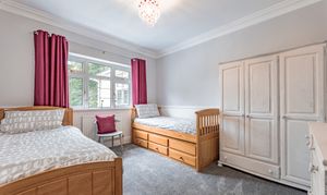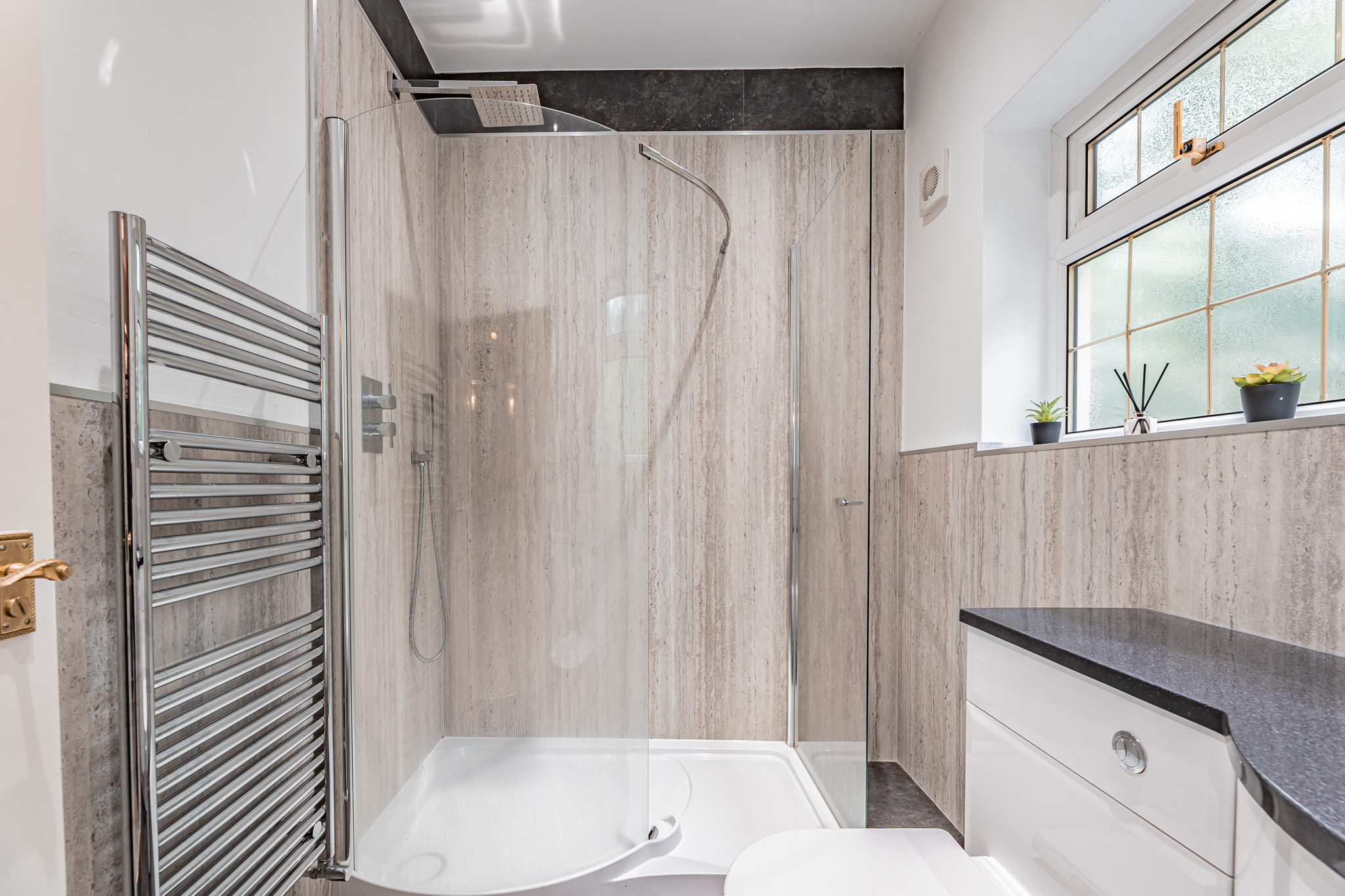 A tall feature window lights the staircase, which rises to a landing with decorative cornicing and an airing cupboard. The principal suite is exceptionally spacious, with maple wardrobes, plantation shutters, and a partitioned bed area. Its ensuite bathroom offers a Jacuzzi bath set beneath an archway, his-and-hers sinks, a corner shower, and excellent water pressure. The additional bedrooms include a front-facing double room, a guest room with its own ensuite, refitted around five years ago, a rear-facing bedroom with beaded windows, and another good-sized double. The family bathroom, provides both a bath and a separate shower. A vast loft runs the full length of the house, partially boarded and easily accessed with a fitted ladder.