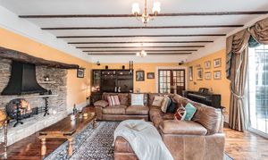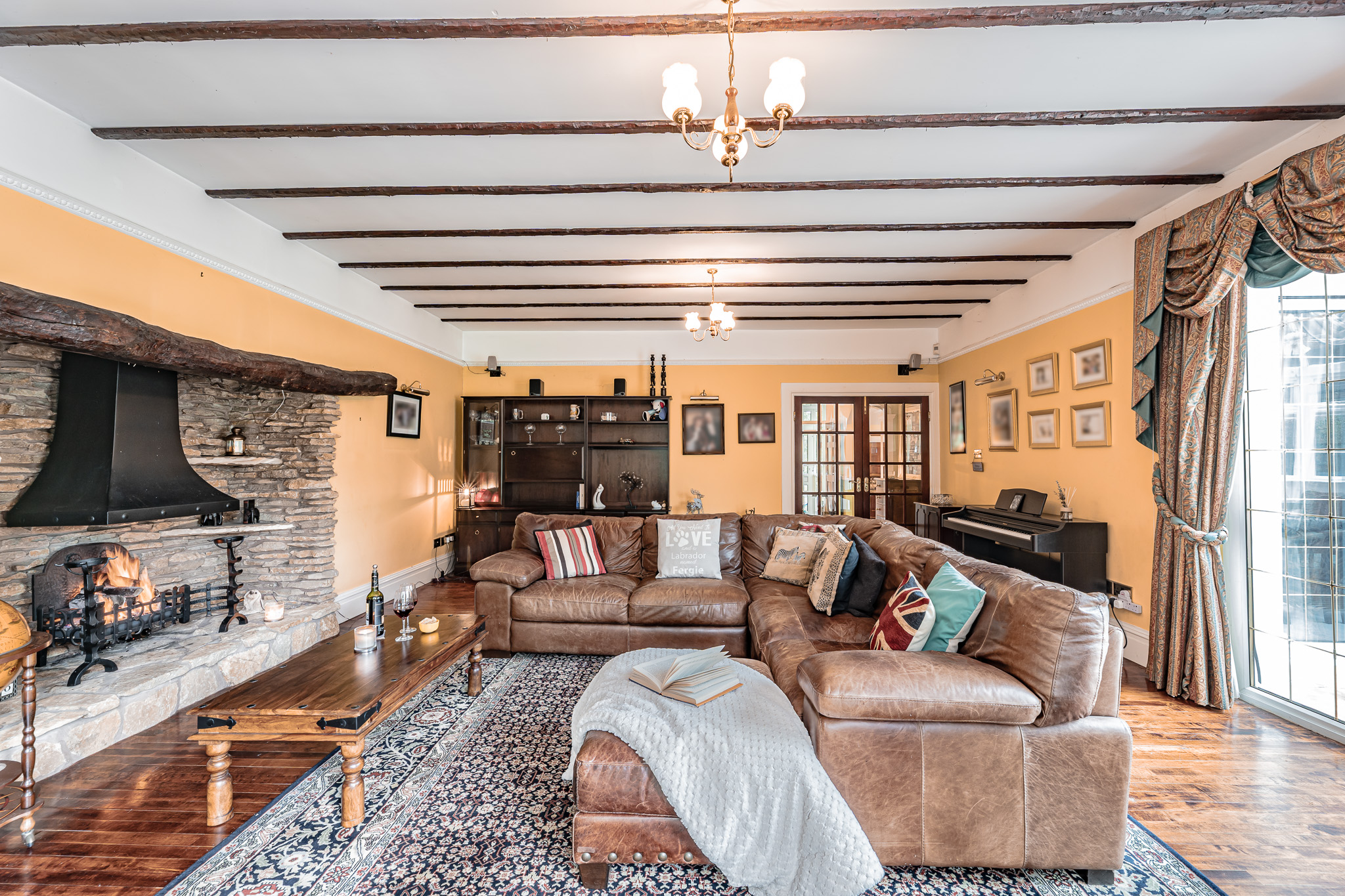 From here, the house unfolds into its main living spaces. A large formal lounge features French polished parquet flooring, a stone fireplace, exposed wooden beams, period coving, and French doors opening both to the patio and to the conservatory. The conservatory itself connects the living room, dining room, and family room, filling the rear of the house with natural light. The dining room is perfectly suited to formal entertaining, accessible from both the hallway and the kitchen, while the family room provides a more relaxed everyday space.