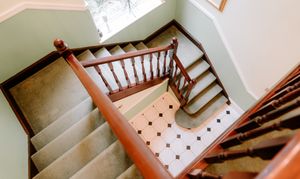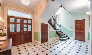 The property is approached by a large driveway with a carport that can hold six to eight cars. A glass double-door porch opens into a grand hallway with black-and-white tiled flooring, ornate coving, and practical understairs storage. To the right of the hallway lies a versatile ground floor sitting room, could be study - currently being used as a downstairs bedroom, complete with a bay window to the front. Next to this reception room is a stylish cloakroom with a heritage sink and wood-effect flooring.