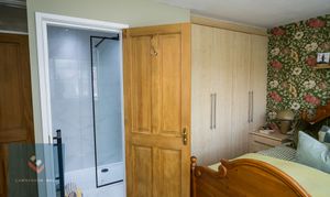 Fitted with a modern shower cubicle with overhead shower and handheld attachment. Wash hand basin. Heated towel rail. Fully tiled walls and floor.