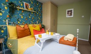 Fitted with a modern bathroom suite including a wonderful yellow freestanding slipper bath with floor standing mixer tap. Wash hand basin with storage drawers below. Low level WC. Fully tiled floor and walls. Underfloor heating. Double glazed window to rear.