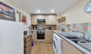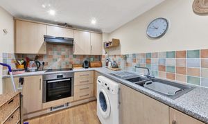 The kitchen is a very good size, benefiting from a range of base and wall units, laminate worktops, wood flooring, tiled splashbacks, inset lighting, an integrated oven, hob and extractor fan, and space for a washing machine, fridge/freezer and other small kitchen appliances.