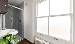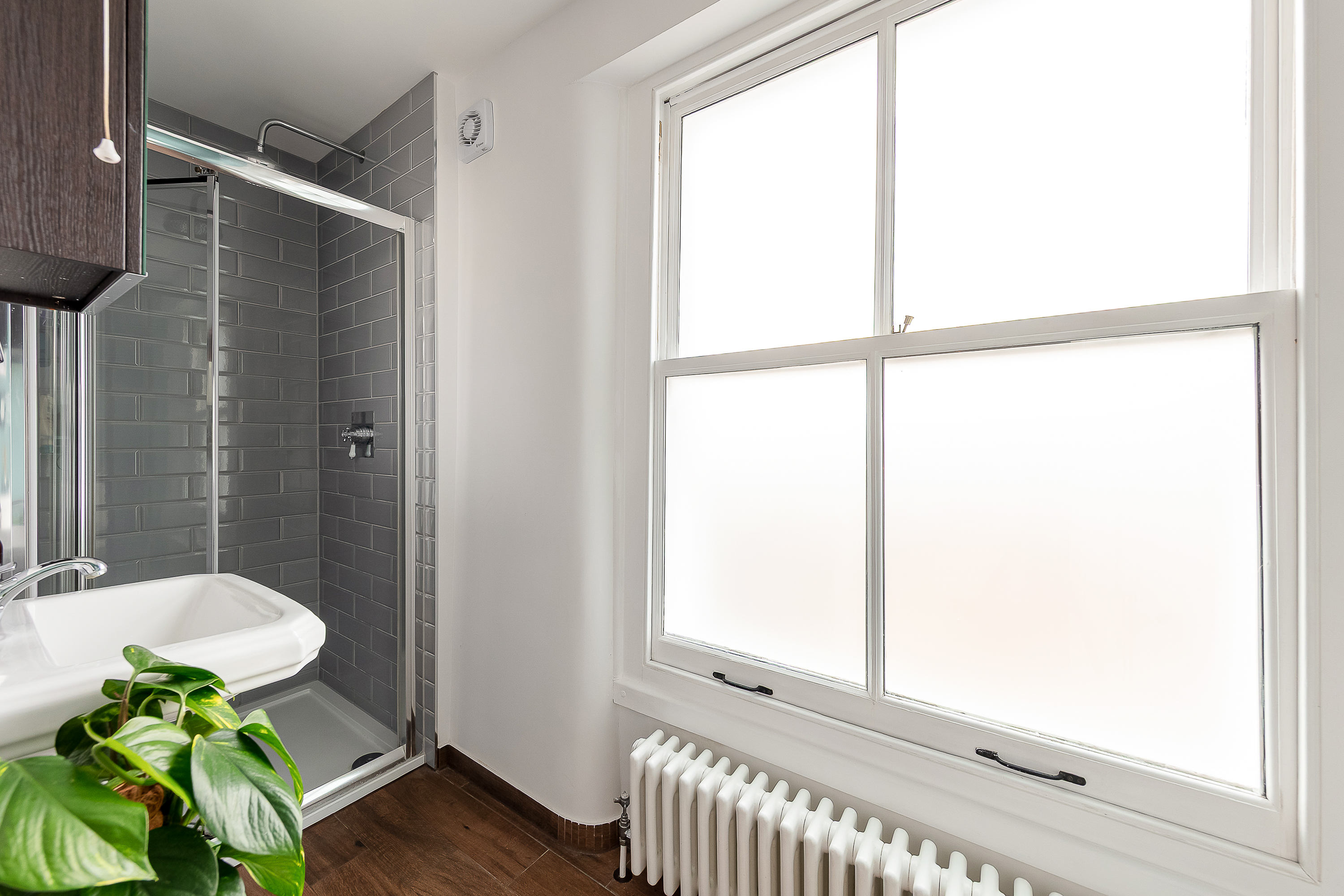 The bathroom on this floor has a walk-in shower with grey metro tiling, a large sash window with frosted glass that fills the room with natural light, wood-effect flooring, and a period-style column radiator. It's a well-finished room and a good size for a shower-only bathroom.