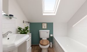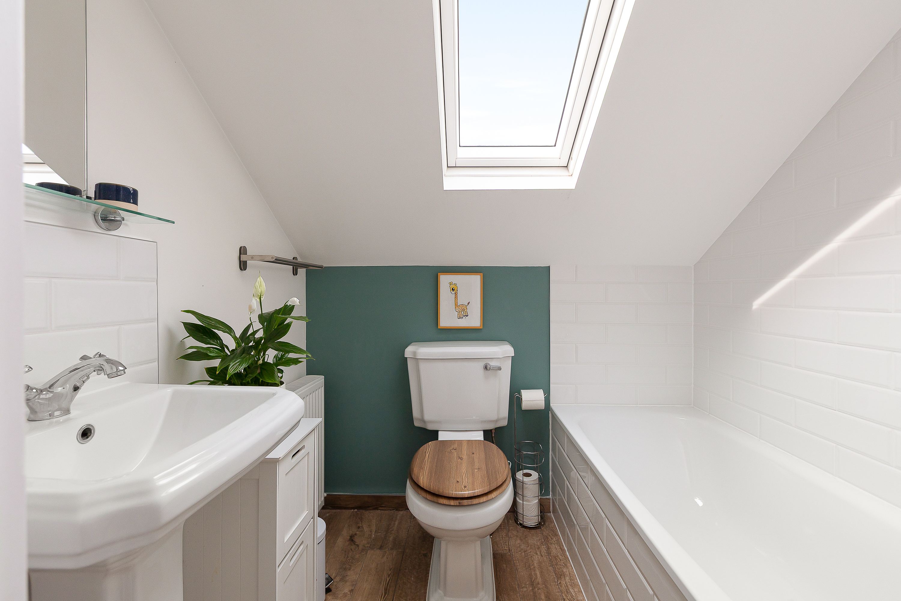 The bathroom on the top floor has a bath with a shower over it with grey metro tiling, a large skylight window that fills the room with natural light, and gives exceptional ventilation, and wood-effect flooring.