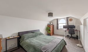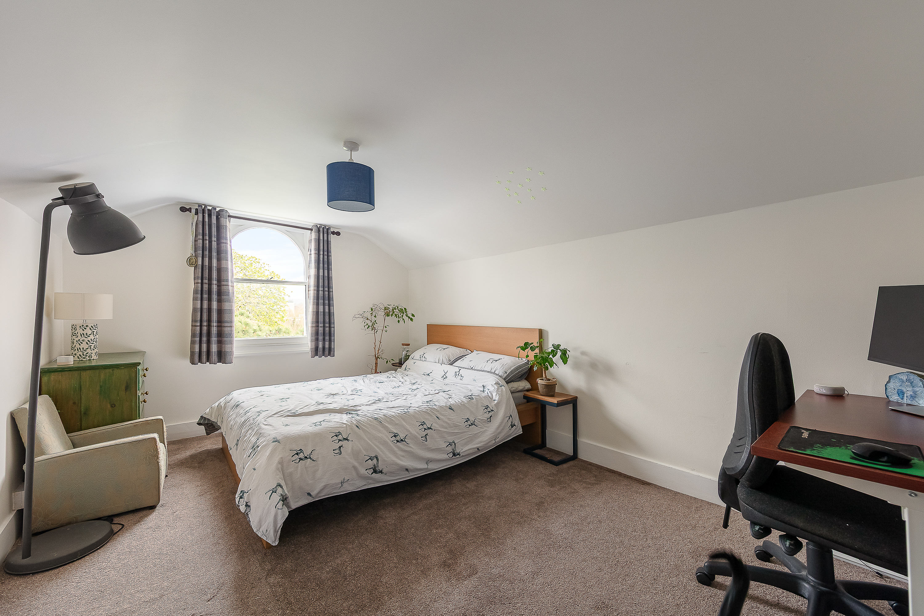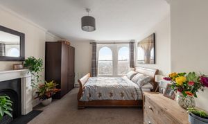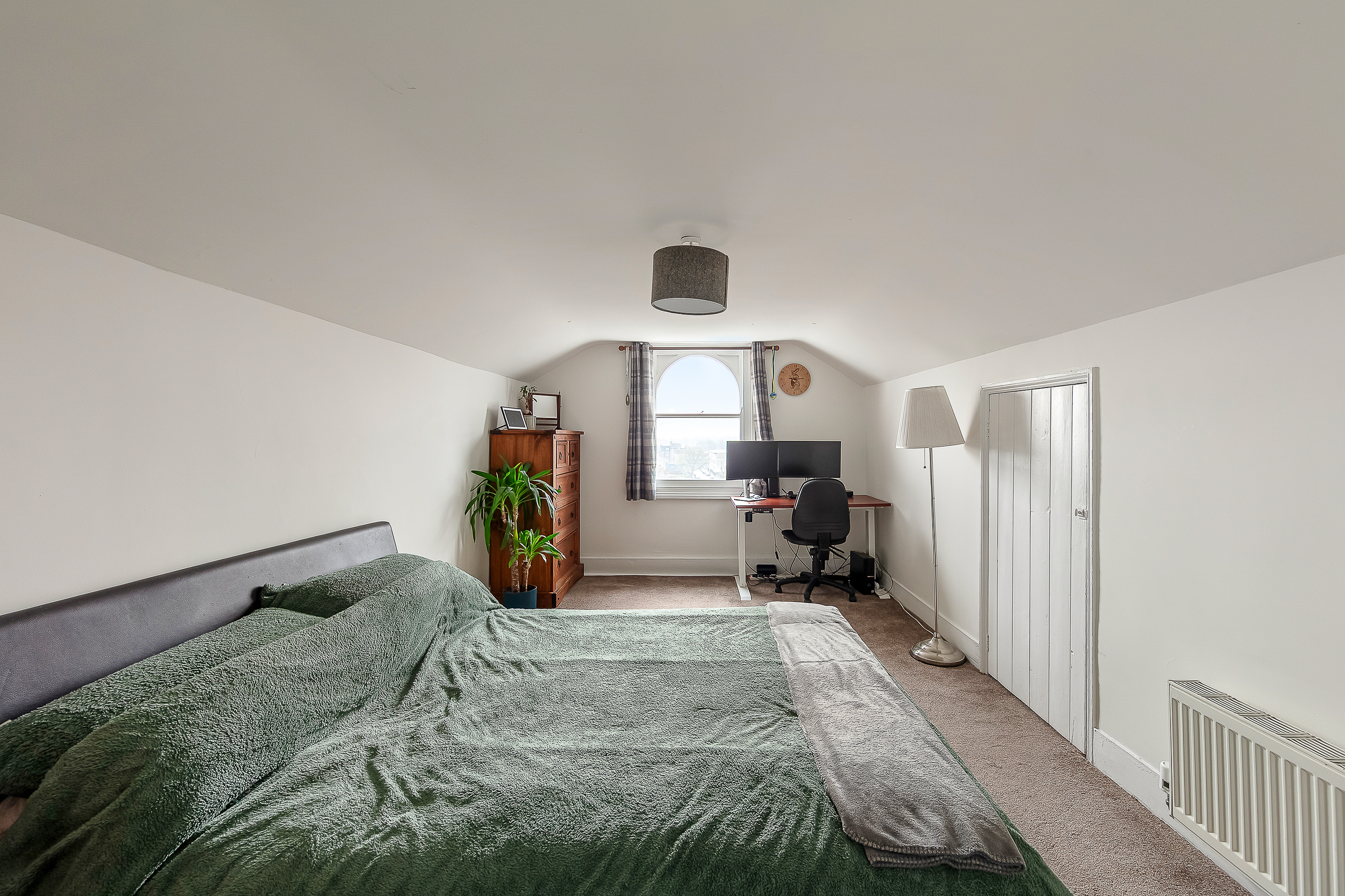 Bedroom one is on the same floor as the living room at 16'4 x 12'0, which makes it a genuinely large principal bedroom. It has the same arched window detail as the living room, the same period coving, and an original fireplace — the proportions are those of a Victorian reception room, because that's effectively what it is. There's room for a double bed, freestanding storage, and a desk without any compromise. Notably, the flat could be used as a two-bedroom, and this bedroom could be repurposed into a proper dining room, which would work really well as it’s adjacent to the kitchen.