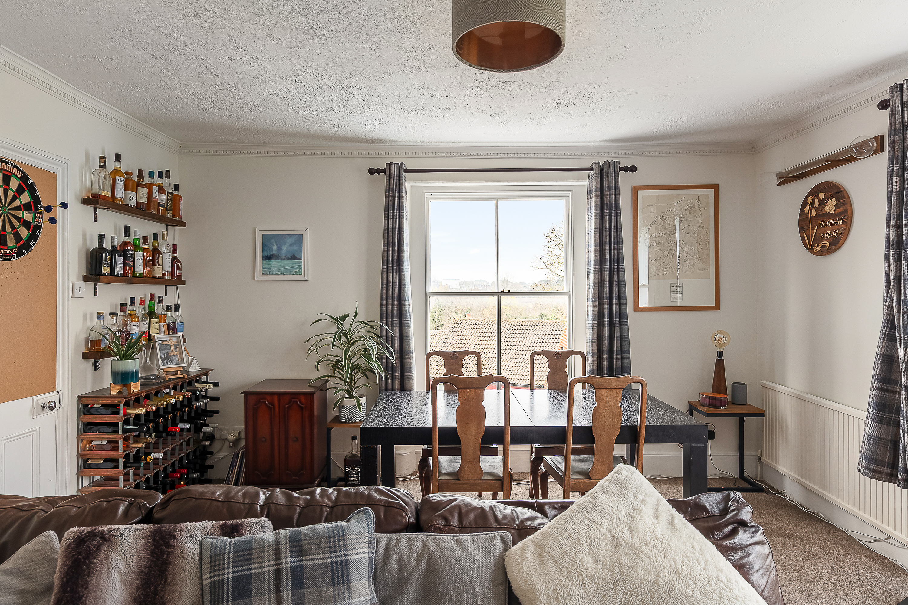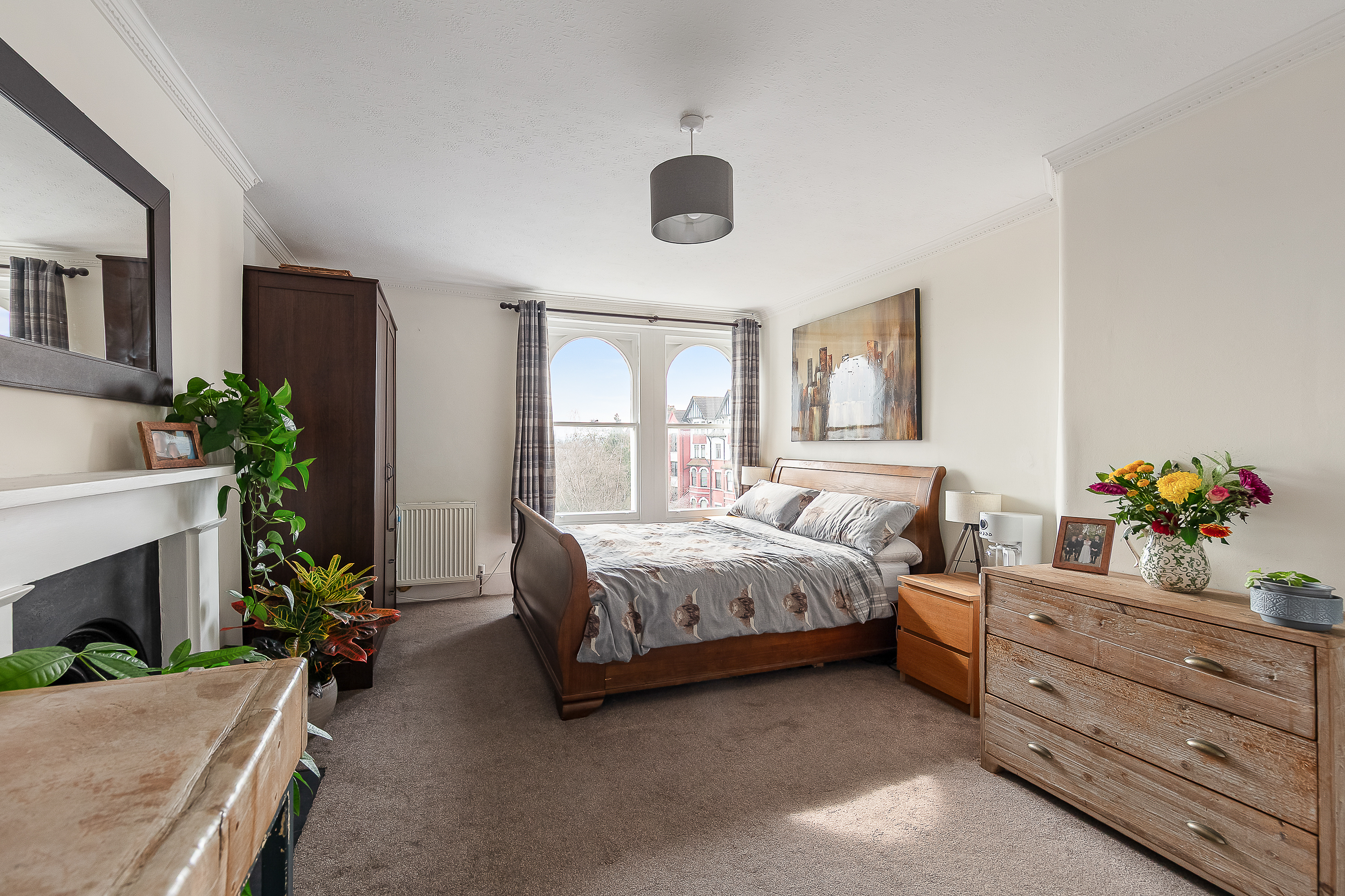 The living and dining room is the flat's standout space. At 17'7 x 14'0 it's a genuinely large room — large enough for a full corner sofa, a proper dining table for six (or more!) and still have floor space left over. The pair of arched sash windows face the front of the building and, because this room is on the second floor of a tall building, the outlook is above the roofline of the neighbouring properties and into open sky and tree canopy — you notice it immediately. The original fireplace with its cast-iron insert sits on the rear wall, and the period style coving runs along the full perimeter.