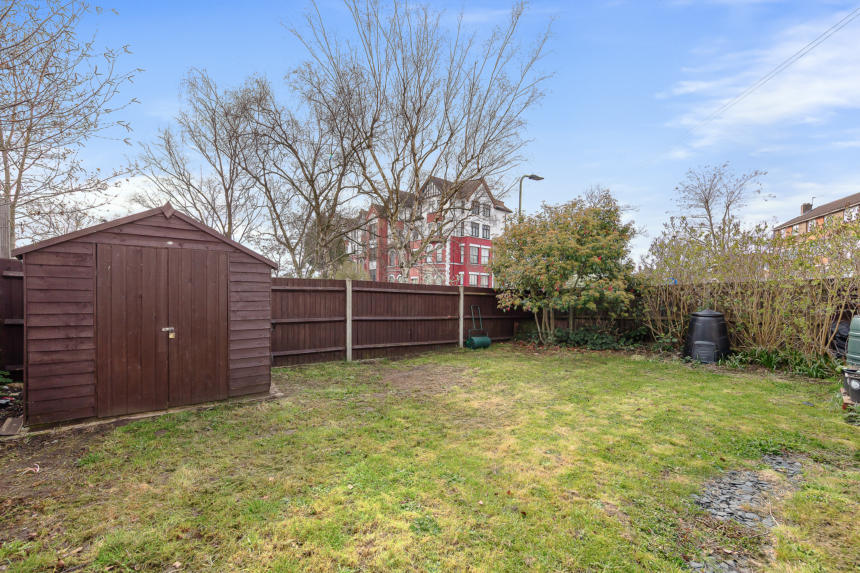 Outside, the flat has its own section of the rear garden. It isn't separated off with fencing — the residents of the building get on well and have kept it open — so in practice it feels like a generous shared garden rather than a token strip. There's a shed for storage, and the garden gets good light given its aspect and the relatively open outlook to the rear.