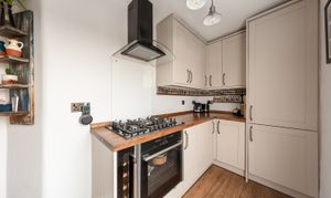 The kitchen has been properly fitted out — shaker-style units in a warm off-white, solid wood worktops throughout, a Belfast sink with a high-specification pull-out tap, a gas hob, and a large extractor. Open shelving on the side wall handles the everyday items and keeps the worktops clear. A sash window next to the sink looks down onto the street below, which gives it more light and life than a rear-facing kitchen of this size would usually have.