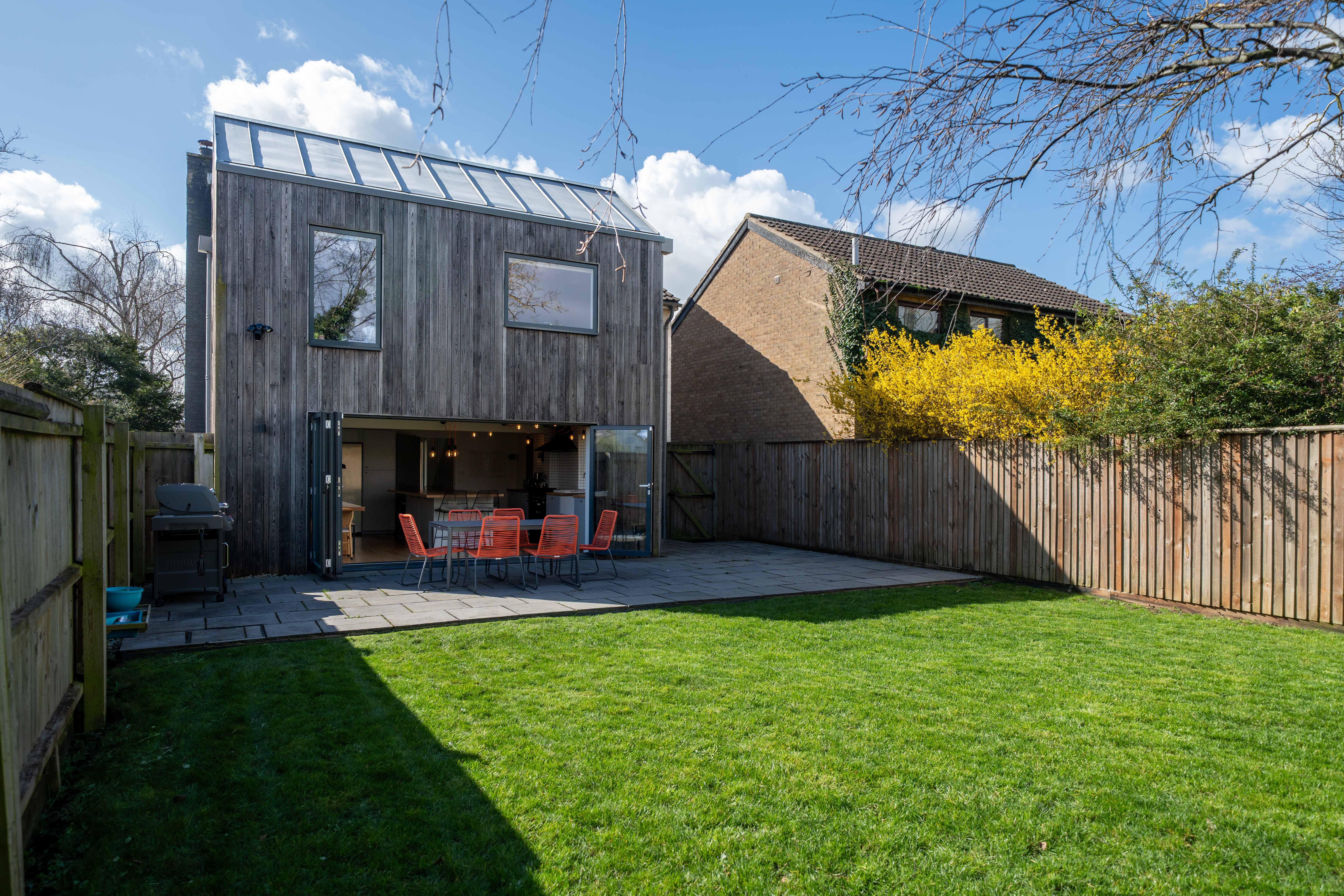 Originally built around 1980 as a four-bedroom detached family house, the property was completely reimagined and extended by QOCA Architects between 2015 and 2017. This superb renovation blends striking architectural design with warmth, comfort and a sense of effortless modern living. The heart of the home is the stunning open-plan kitchen and living space at the rear, designed to maximise light and connection with the garden. This extension, finished in Shou-Sugi-Ban charred larch with a zinc roof, features full-width folding doors that open directly onto a beautifully landscaped garden, creating a perfect flow between indoor and outdoor spaces. The kitchen itself is both practical and stylish, designed with family living and entertaining in mind. Appliances include a fridge/freezer, range cooker, integrated dishwasher and integrated oven, with wood counter tops and oak flooring, leading onto a useful utility room with additional storage and access to the garden. Lastly, a much requested home office.