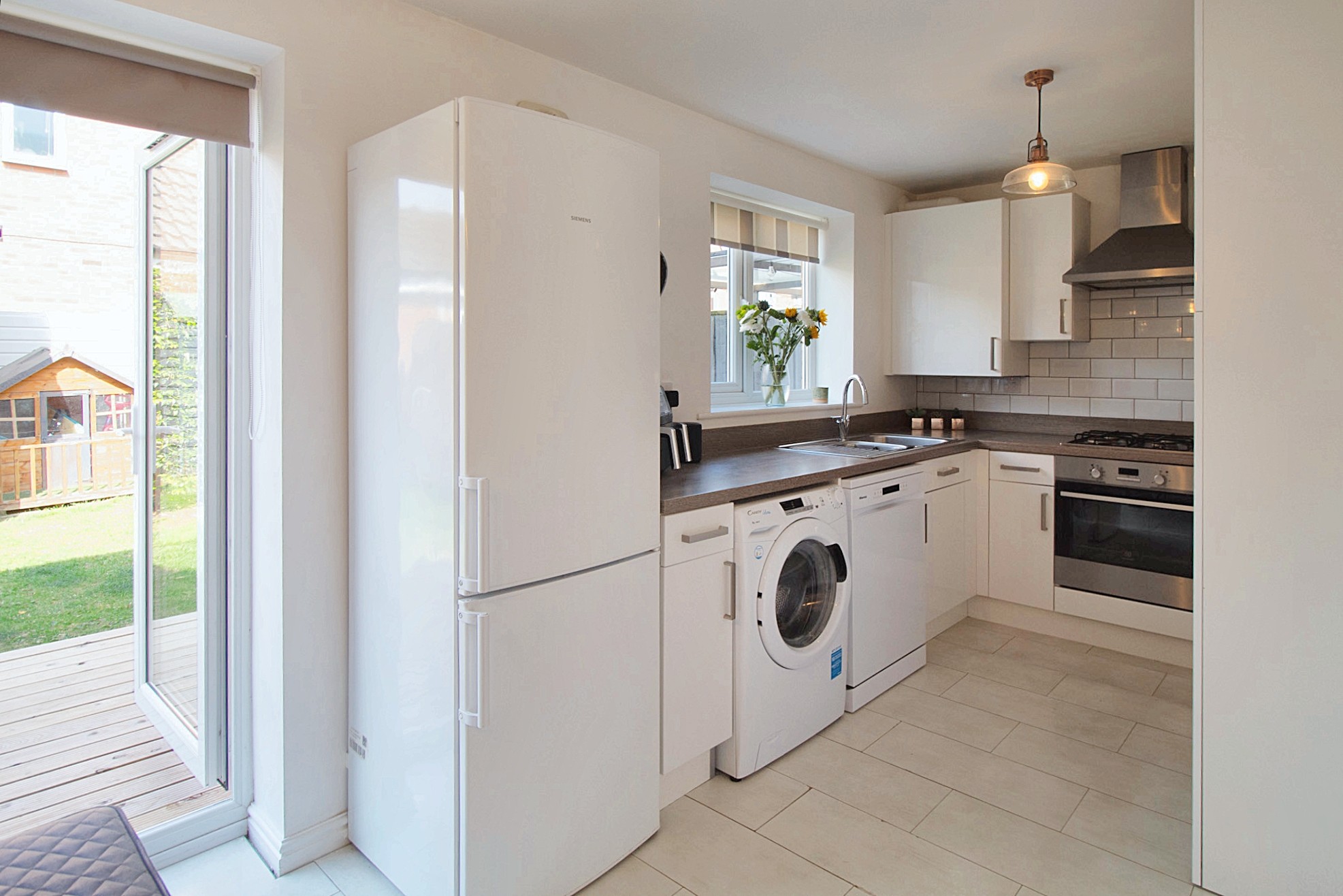 With laminate flooring, laminate work surfaces, sink/drainer, hob, oven, extractor fan, double glazed window, space for appliances, radiator and patio doors leading to the rear garden.
