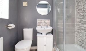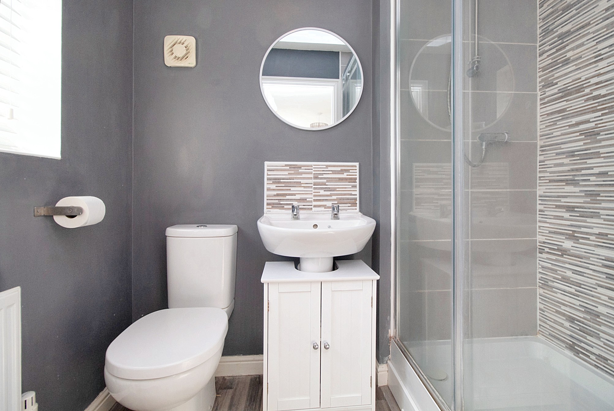 With vinyl flooring, shower cubicle, wash hand pedestal basin, WC, radiator and double glazed window.