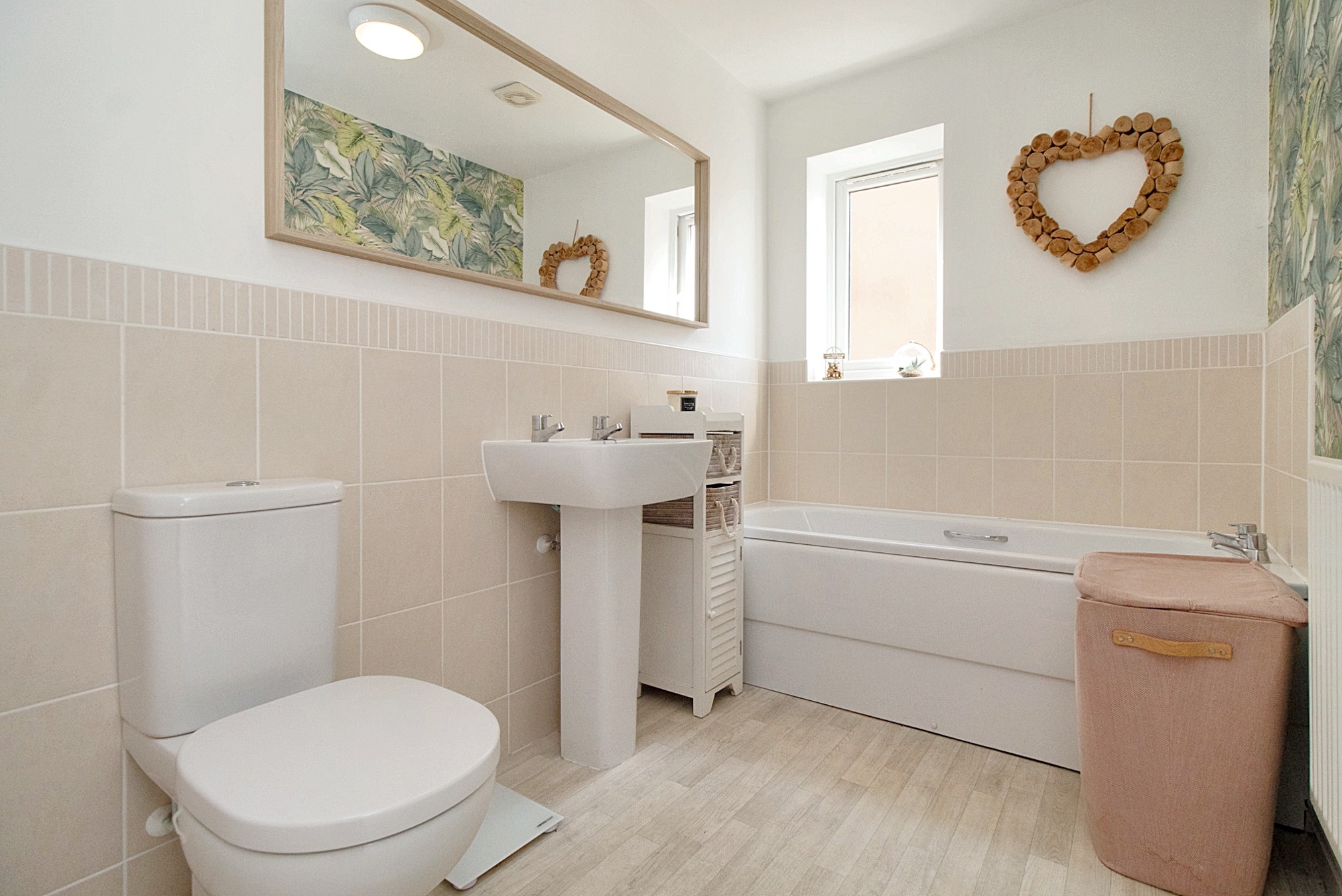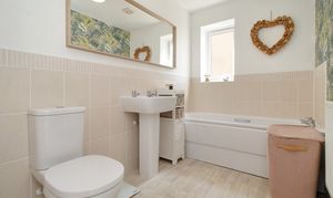 With vinyl flooring, bath tub, wash hand pedestal basin, double glazed window, radiator and WC.
