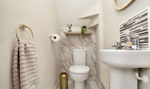 With karndean vinyl flooring, WC, radiator and wash hand pedestal basin.