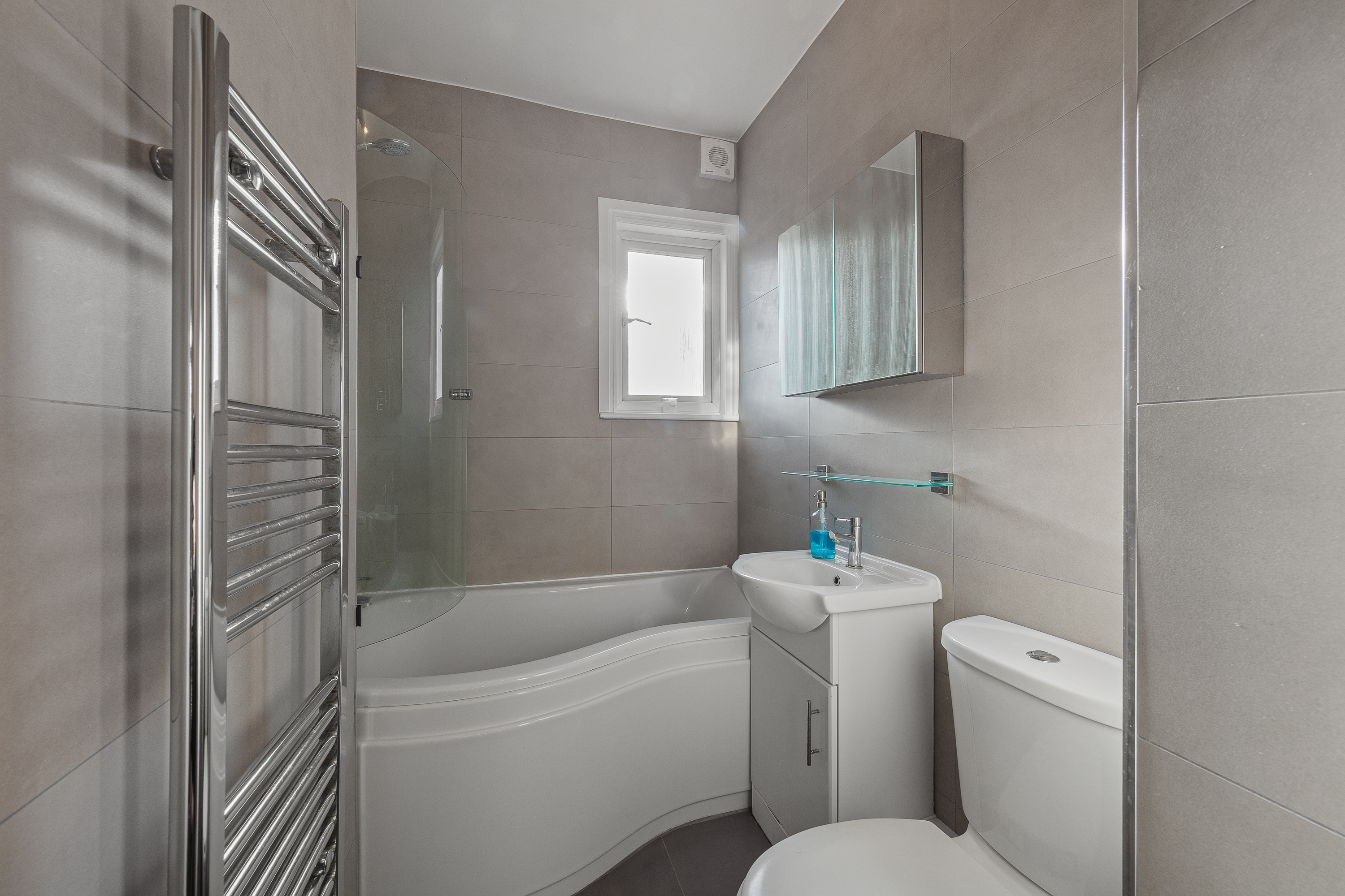 The bathroom has been updated with large-format grey tiles, a white suite, and a P-shaped bath with a shower over it. There's a heated towel rail and a window for ventilation. It's clean, modern, and functional, and is finished really nicely.