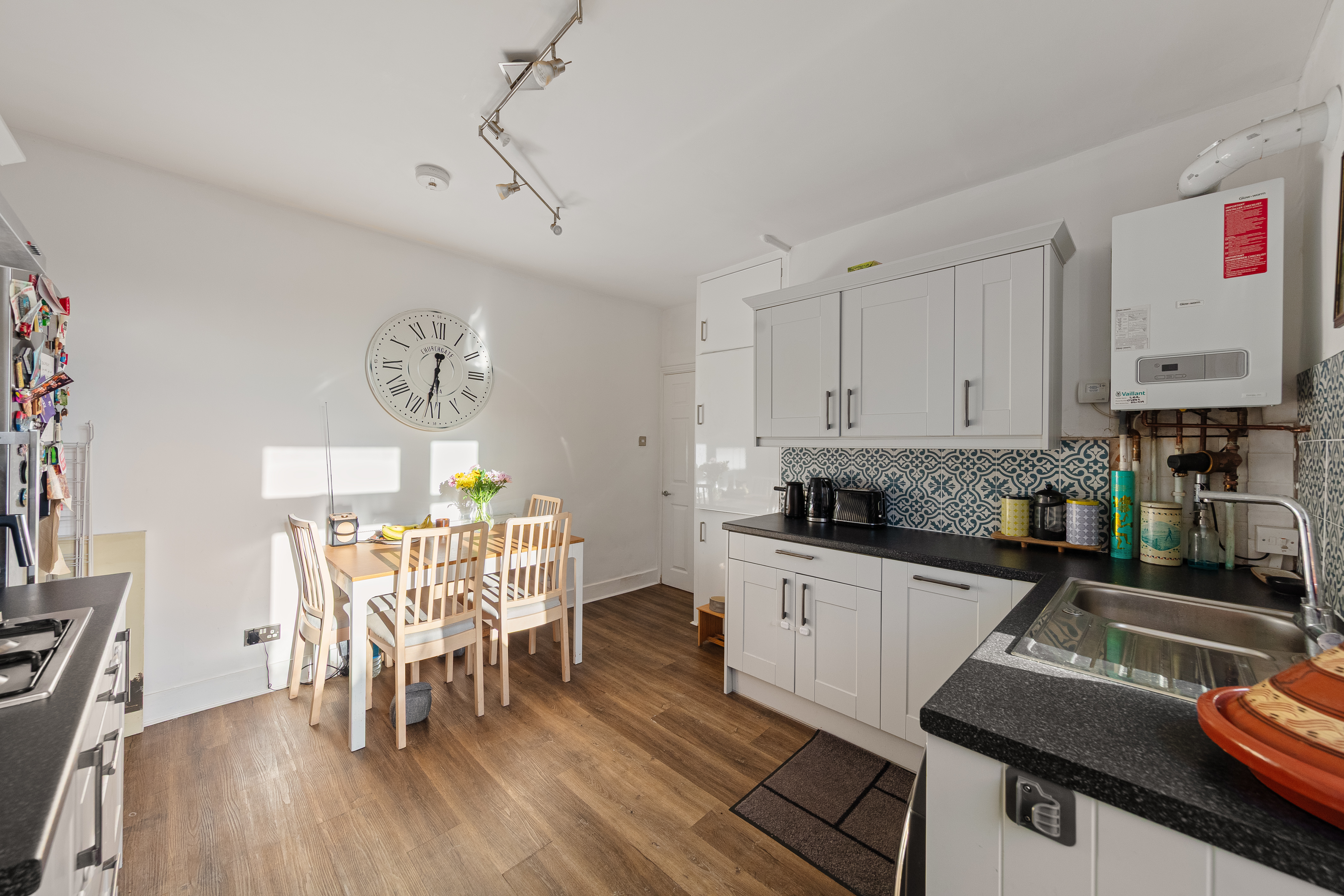 Diagonally opposite the reception is the kitchen/diner, which is at the back of the flat and gives access to the garden space. It has been fitted with white modern units, dark worktops, and patterned splashback tiles that add a bit of character. There's an integrated oven, a gas hob, space for a washing machine, and room for a dining table with seating for four or even six if needed. As the kitchen opens directly onto the garden via a glazed door, and there is floor-to-ceiling glass (which faces south!), you get a fantastic amount of natural light and easy access to your outside space, ideal for BBQs and outdoor entertaining.