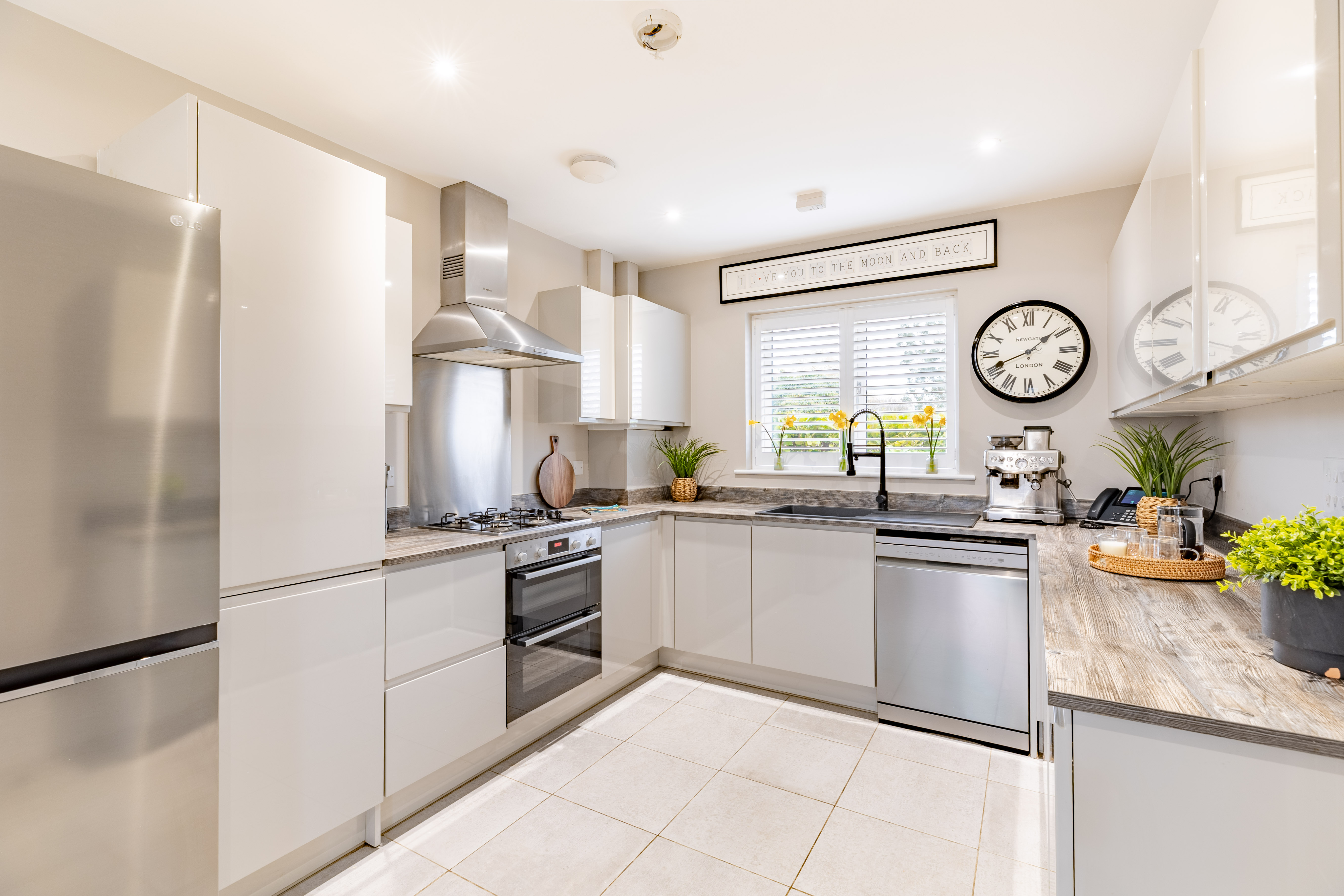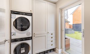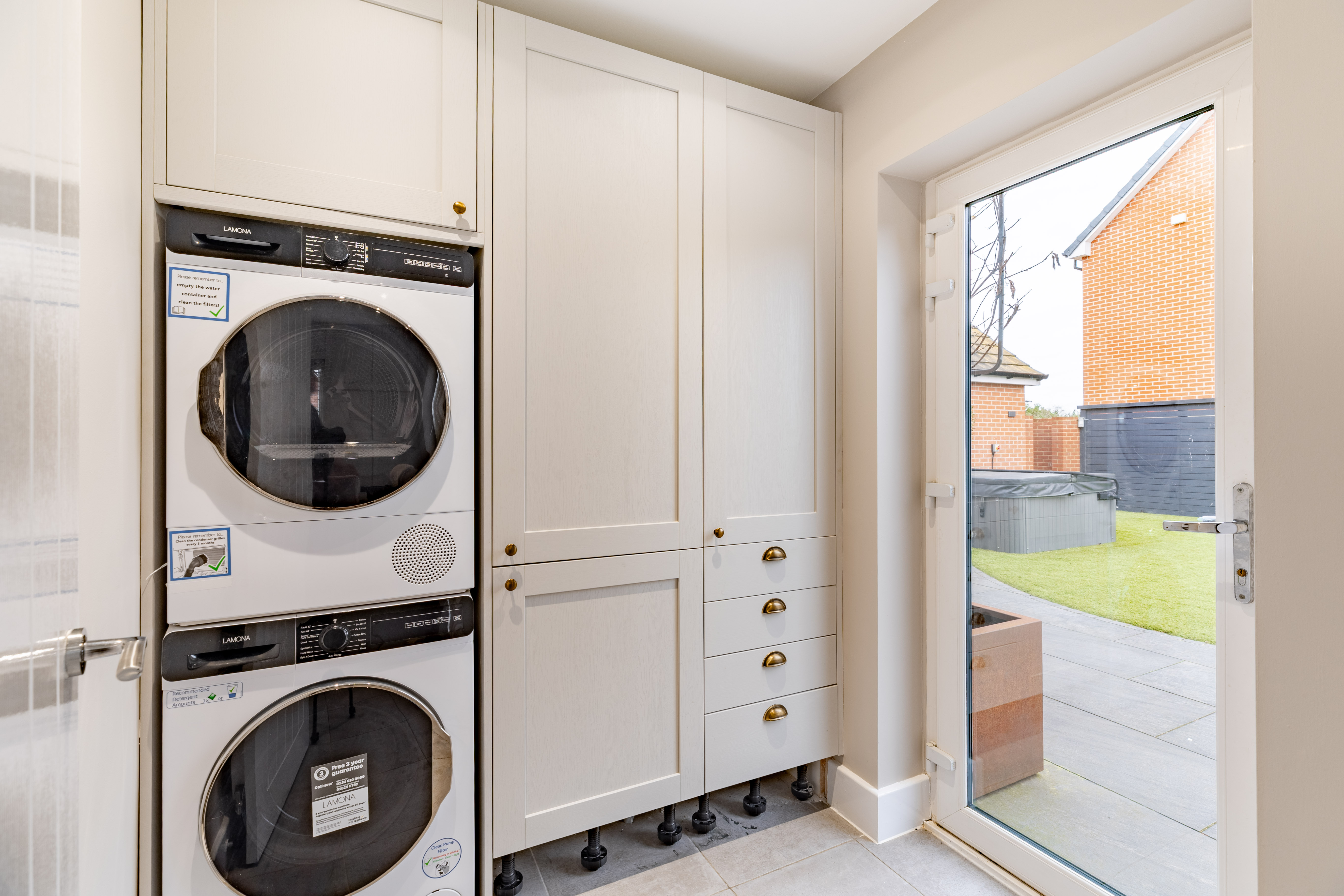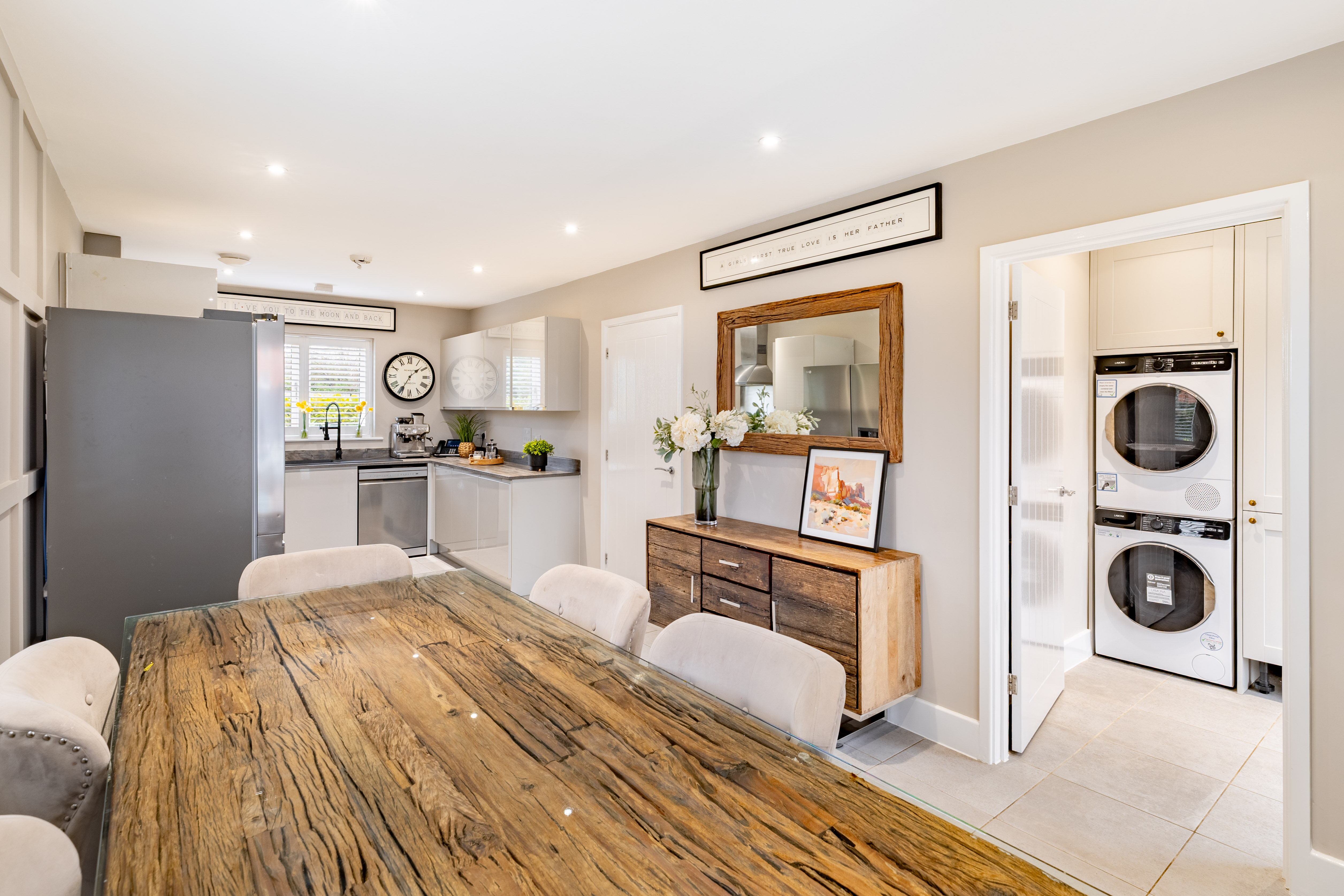 - High-spec kitchen – Trendy grey gloss units, Bosch integrated appliances, and a coordinating utility room.