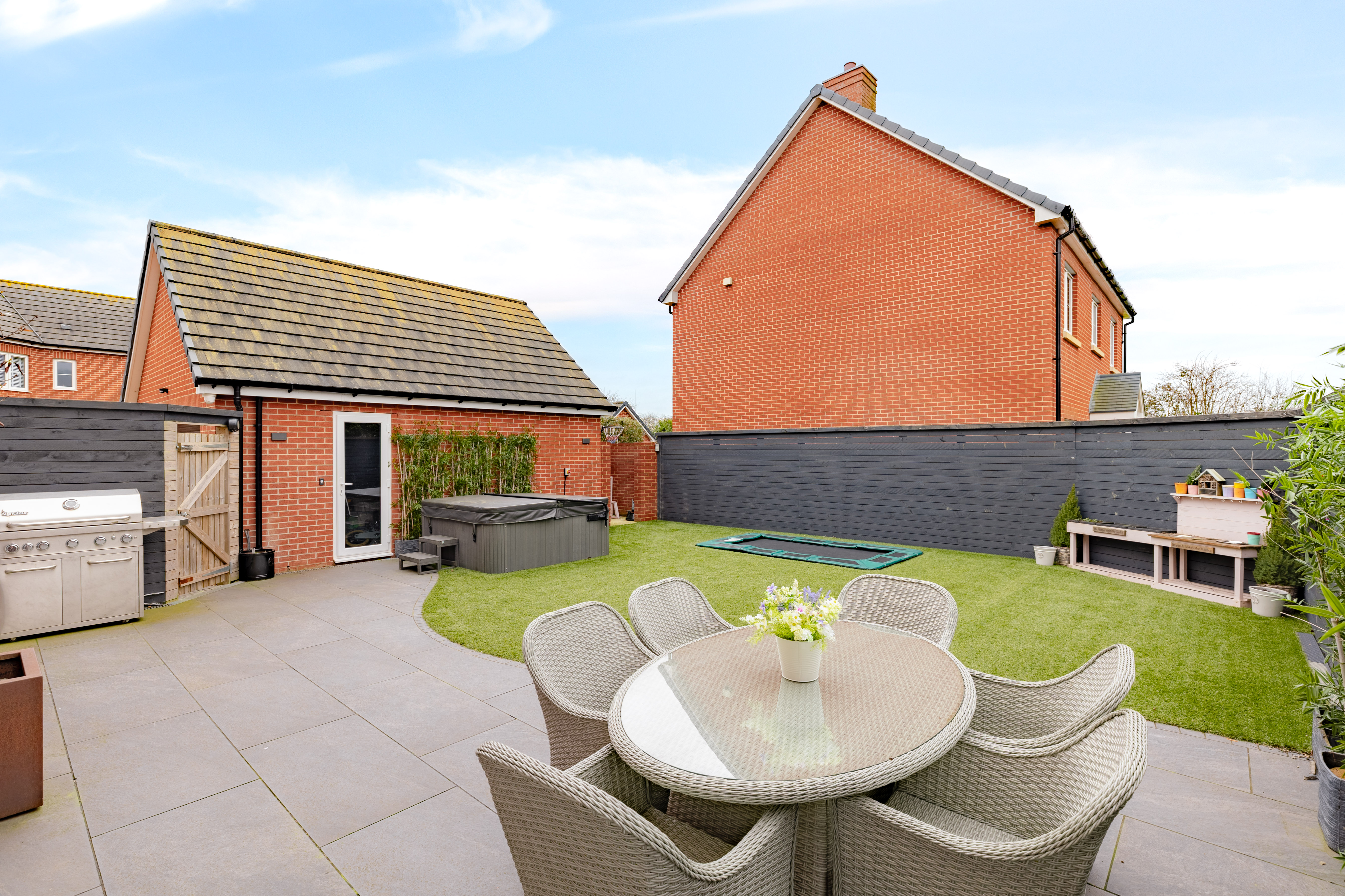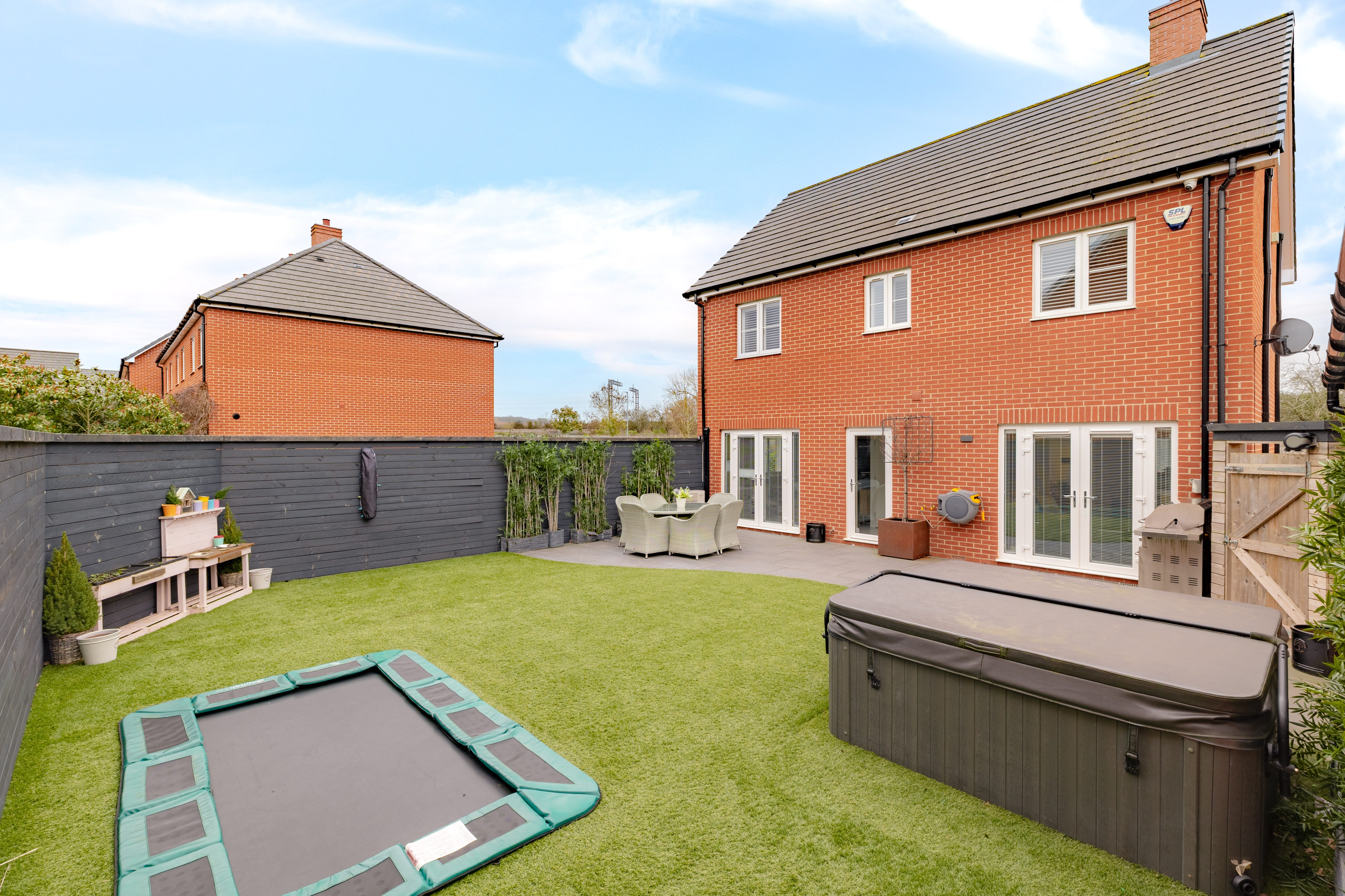 - Landscaped west-facing garden – Private, unoverlooked, with treetop views, a sunken trampoline, artificial lawn, and new patio.