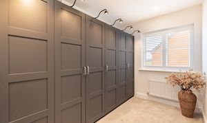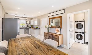 The kitchen/diner is super-trendy, fitted in an extensive range of grey gloss units with co-ordinating worktops and upstands, and a stainless steel Franke sink. Integrated appliances are all Bosch, including an oven, grill, gas hob, extractor, dishwasher and fridge/freezer. The dining space gives the potential to host the whole family. The adjoining utility has cupboards and worktops in the same design, plus a sink and drainer and an integrated washing machine. French doors from both the lounge and the kitchen, and a single door from the utility open onto the patio for flow through the house and the garden.