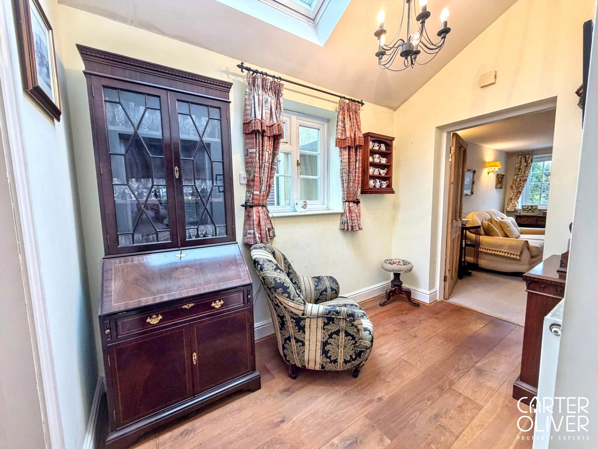 The bright and airy conservatory provides a seamless connection to the beautifully landscaped garden, which features a lush lawn, mature trees, a tranquil pond, and a well-maintained patio - perfect for relaxing, entertaining, or enjoying the surrounding greenery all year-round. Each of the three bedrooms is thoughtfully designed, with large windows that flood the rooms with natural light, along with offering generous storage. Period features such as decorative fireplaces and elegant wooden flooring add to the cottage’s unique character, while the home office provides a peaceful and practical workspace. The bathrooms are finished to an excellent standard, boasting walk-in shower to the ensuite, modern fixtures, heated towel rails, and decorative tiling that combine for both luxury and comfort.
