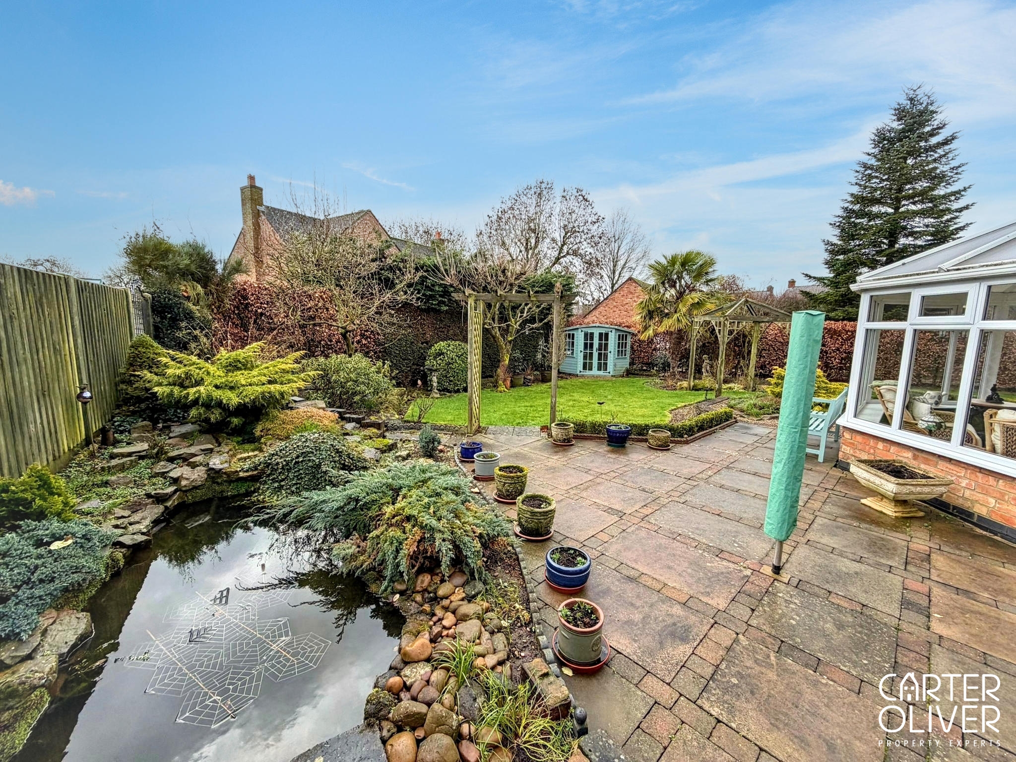 A large garden that wraps around from the front to the side, with a view from the lounge, and then to the side where it meets the rear garage and driveway. There is even a gate that connects you to the allotments. Having been well maintained, and offering a tranquil space to retreat after a hard day at work and plenty of room for children to run around in a safe environment.