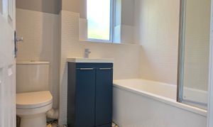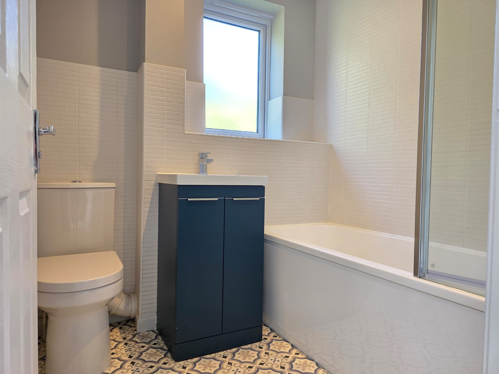 The newly fitted modern bathroom includes panel bath with shower over, low level flush WC, vanity unit with integrated sink and mixer tap, part tiled walls, extractor and obscure UPVC double glazed window.