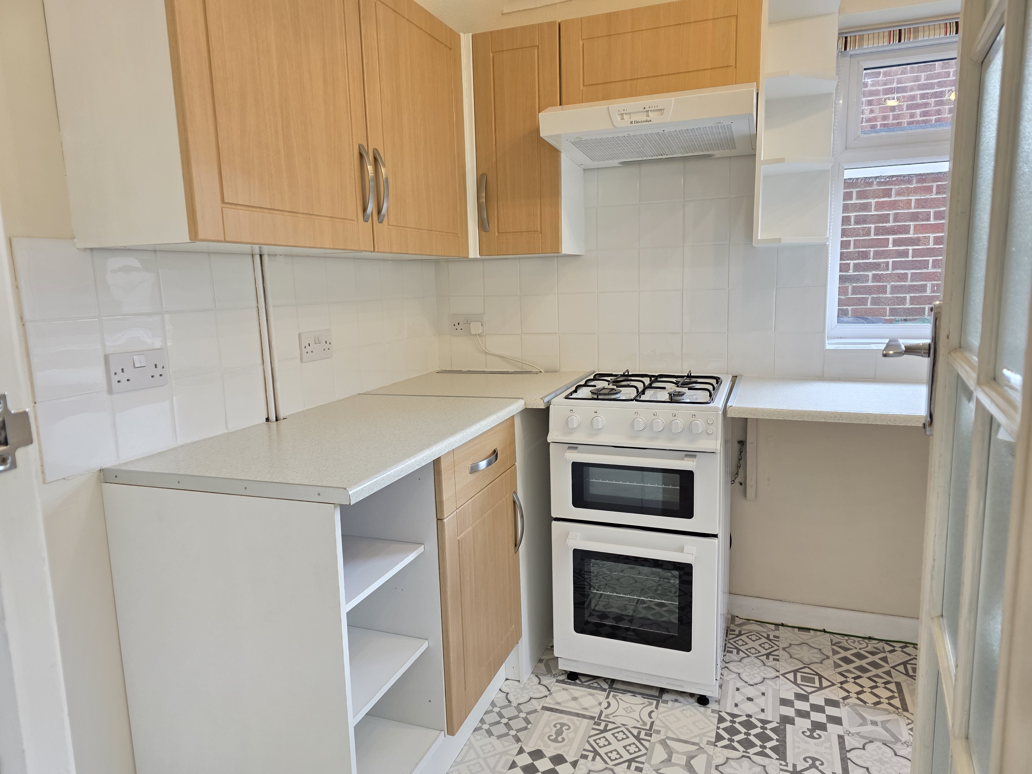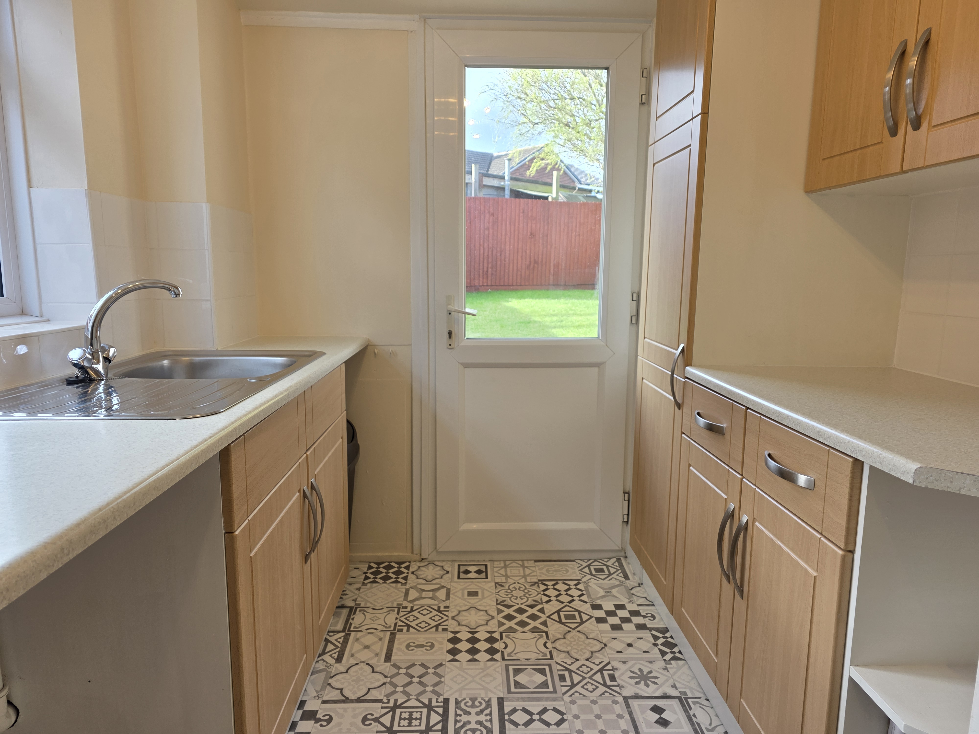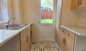 The gally kitchen includes a number of wall, base and large units, rollover worktop, stainless steel sink and drainer with mixer tap, space for a cooker appliance, extractor, space and plumbing for a washing machine, tiled splashbacks, space for a fridge/freezer and UPVC double glazed window and door.