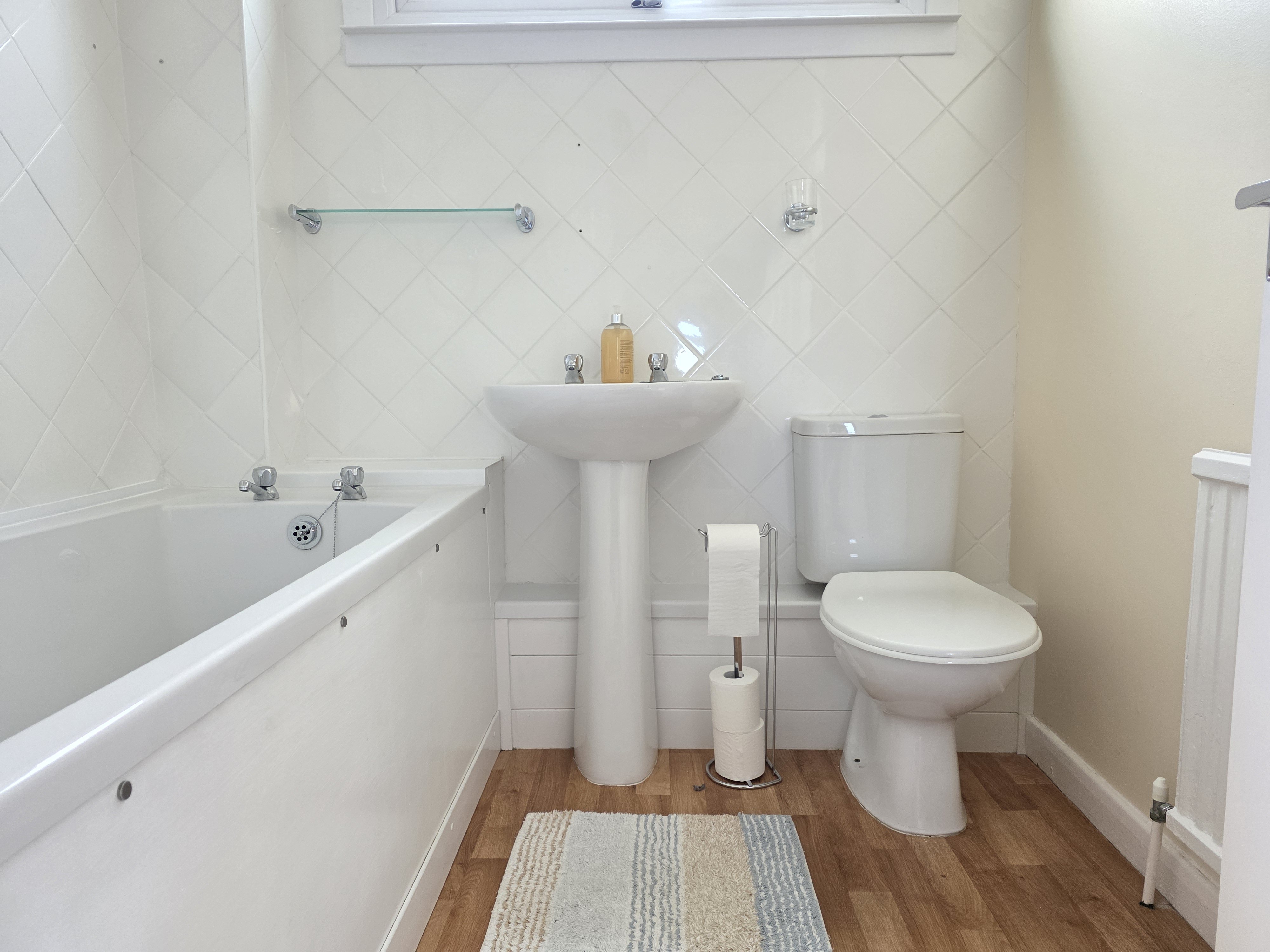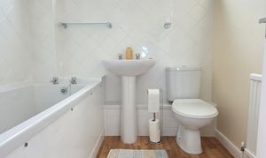 This includes a white three piece comprising of a low level flush WC, wash hand basin, panel bath with electric shower over, vinyl flooring, radiator, part tiled walls and UPVC double glazed window.