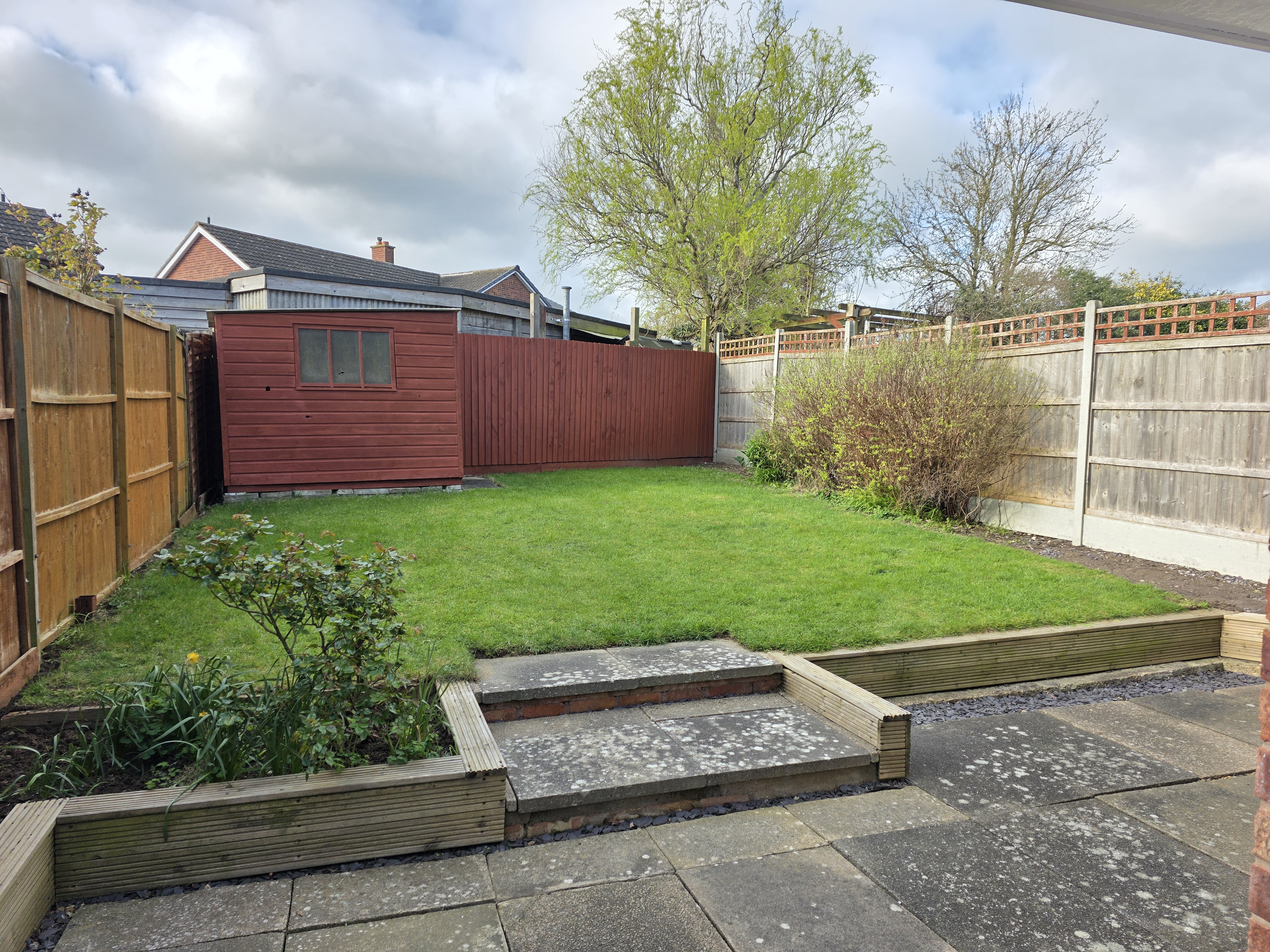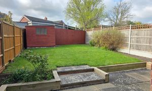 Behind the property, there is a large slabbed patio, raised lawn, shrub areas, fenced boundaries, shed, cold water tap and rear access into the garage.