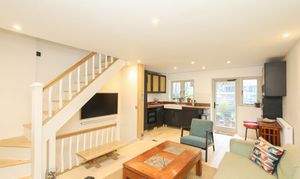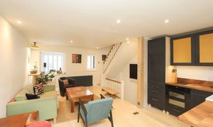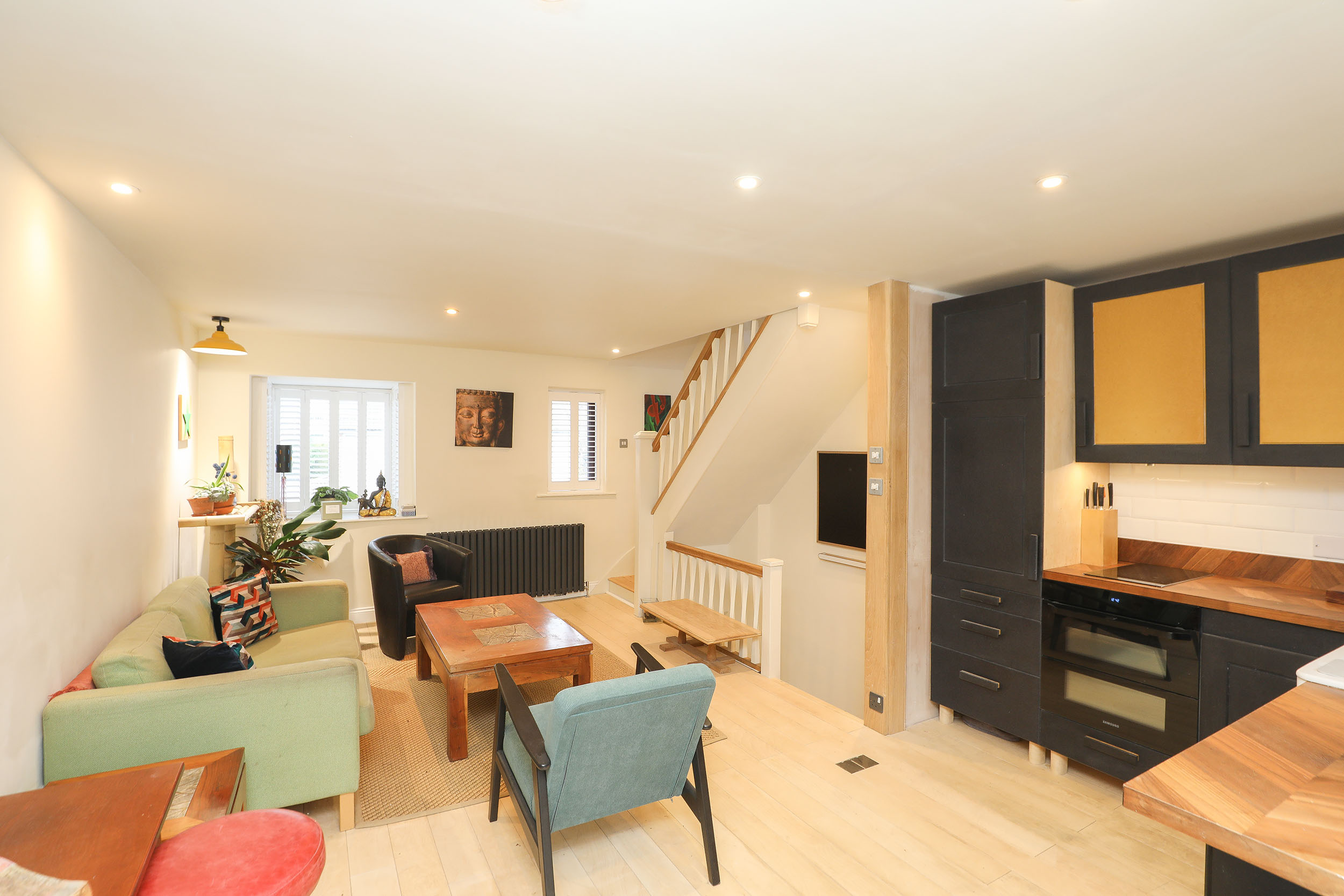 The property opens into a spacious entrance hall, which also incorporates a practical utility space. The first floor is dedicated to an impressive open-plan living space, thoughtfully designed for modern lifestyles. The kitchen features a bespoke, handmade design, fitted with a range of integrated appliances and a distinctive dual Belfast sink, while the overall layout offers excellent flexibility, allowing the space to be arranged in a variety of ways to suit individual needs, whether prioritising dining, entertaining, or a more defined lounge area. A bay window draws in natural light, and doors to the rear create a great connection to the garden.