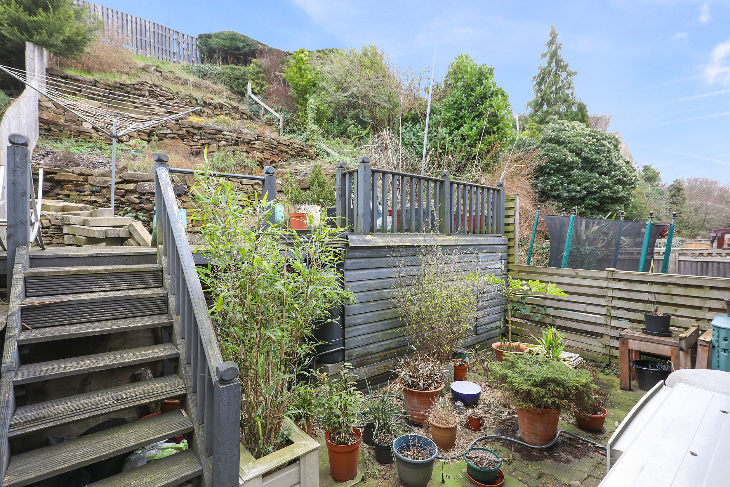 Outside, the tiered rear garden provides a fully enclosed outdoor space with separate areas for relaxing and entertaining. A lower patio works well for outdoor dining, while an upper decked seating area enjoys an elevated outlook. The garden would benefit from landscaping and general upkeep, but offers clear potential for those keen to put their own stamp on it.