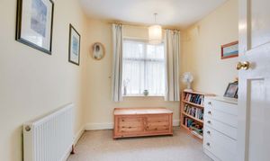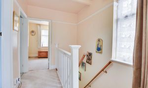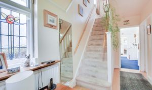 With secondary double glazed part leaded window to the side elevation, original part leaded stain glazed door to the front elevation, stairs to first floor with under stairs storage cupboard, laminate floor, radiator.