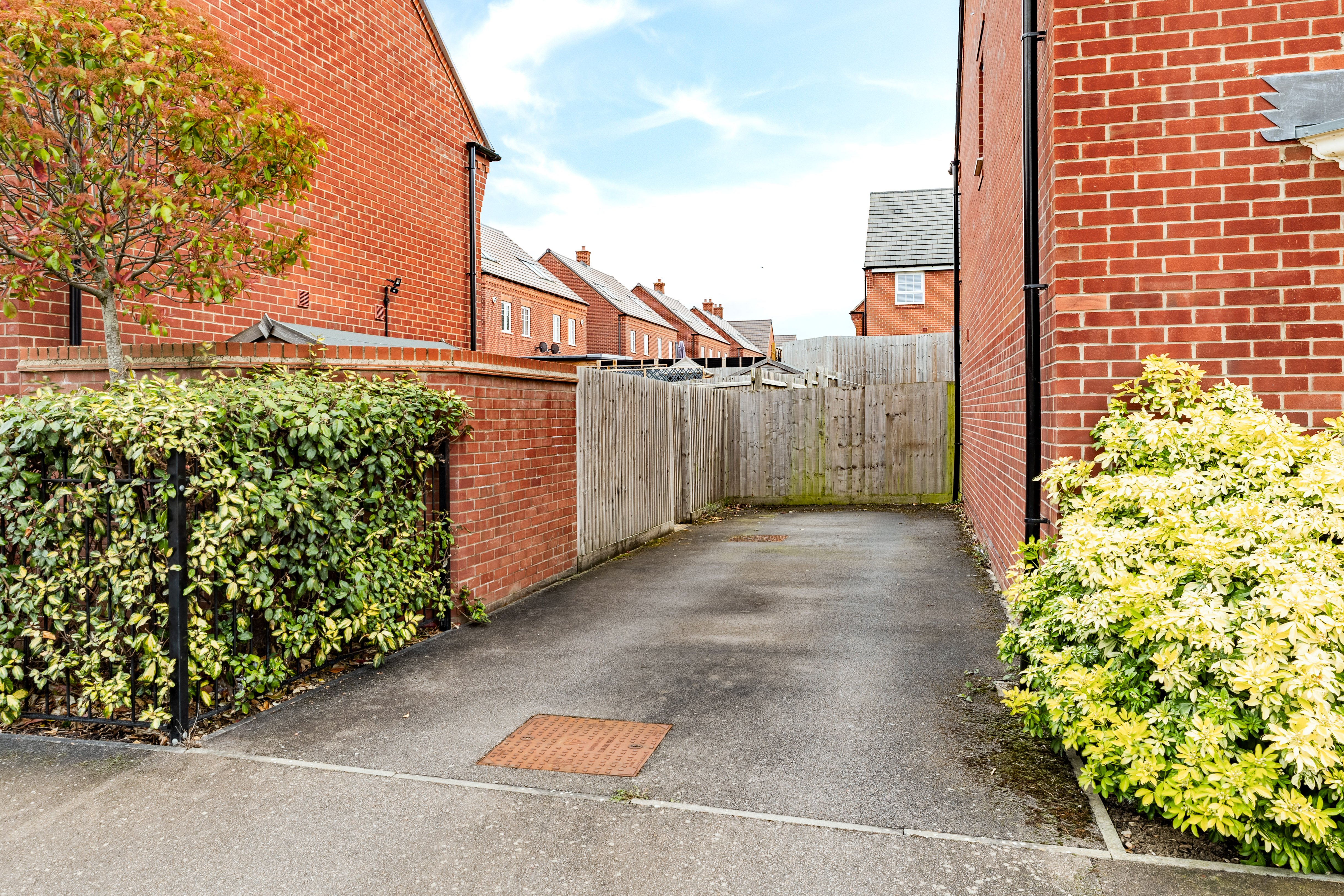 The south-facing rear garden is a particular asset, enjoying generous sunshine throughout the day and offering a private setting enhanced by fencing. The garden leads directly to the driveway, creating convenient access and excellent flow for outdoor living. The plot has proven ideal for dog walking and enjoying the peaceful surroundings. A private driveway provides off-street parking to the side of the property, while a hedged front garden adds privacy to the front of the house.